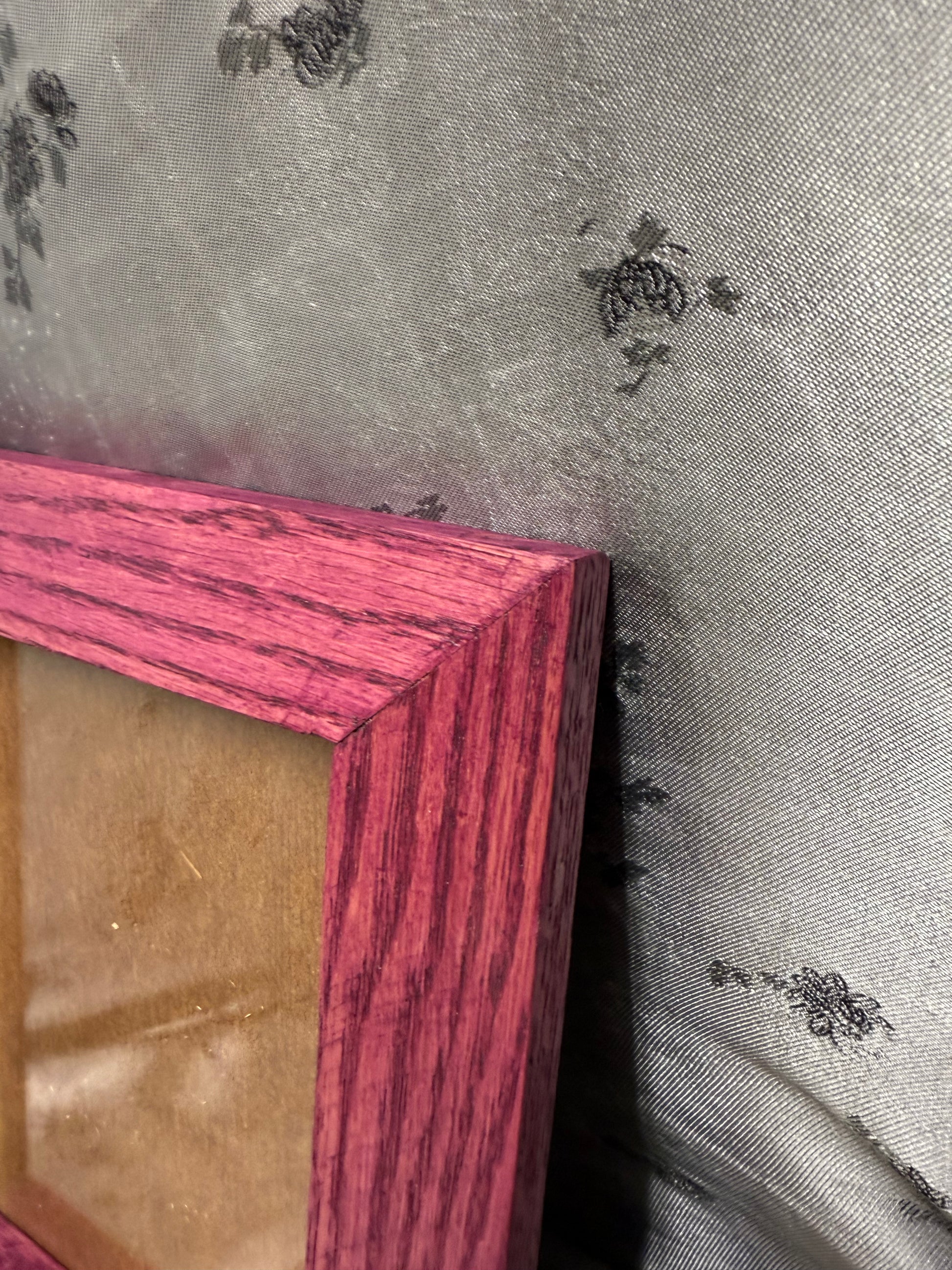 This unique 5x7 picture frame is handcrafted from Red Oak reclaimed from a kitchen table, featuring beautiful natural wood grain and character. Finished with a stunning Cherry Blossom stain and satin poly, it offers both elegance and functionality, perfect for displaying your cherished memories in any refined home setting.