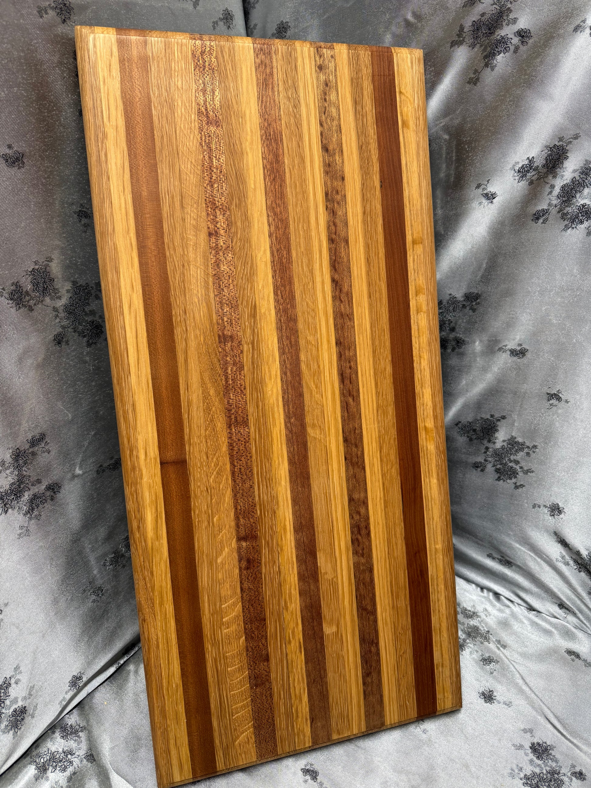 Crafted from Red Oak, American Cherry, and African Mahogany, this extra-large cutting board showcases exceptional grain patterns and rich, timeless color. Its sturdy 8-pound build offers both elegance and performance, perfect for displaying, serving, or preparing generous cuts including an entire beef tenderloin. A striking addition to any refined kitchen. Dimensions: 11-1/2 inches by 24-1/2 inches by 1-3/8 inches.