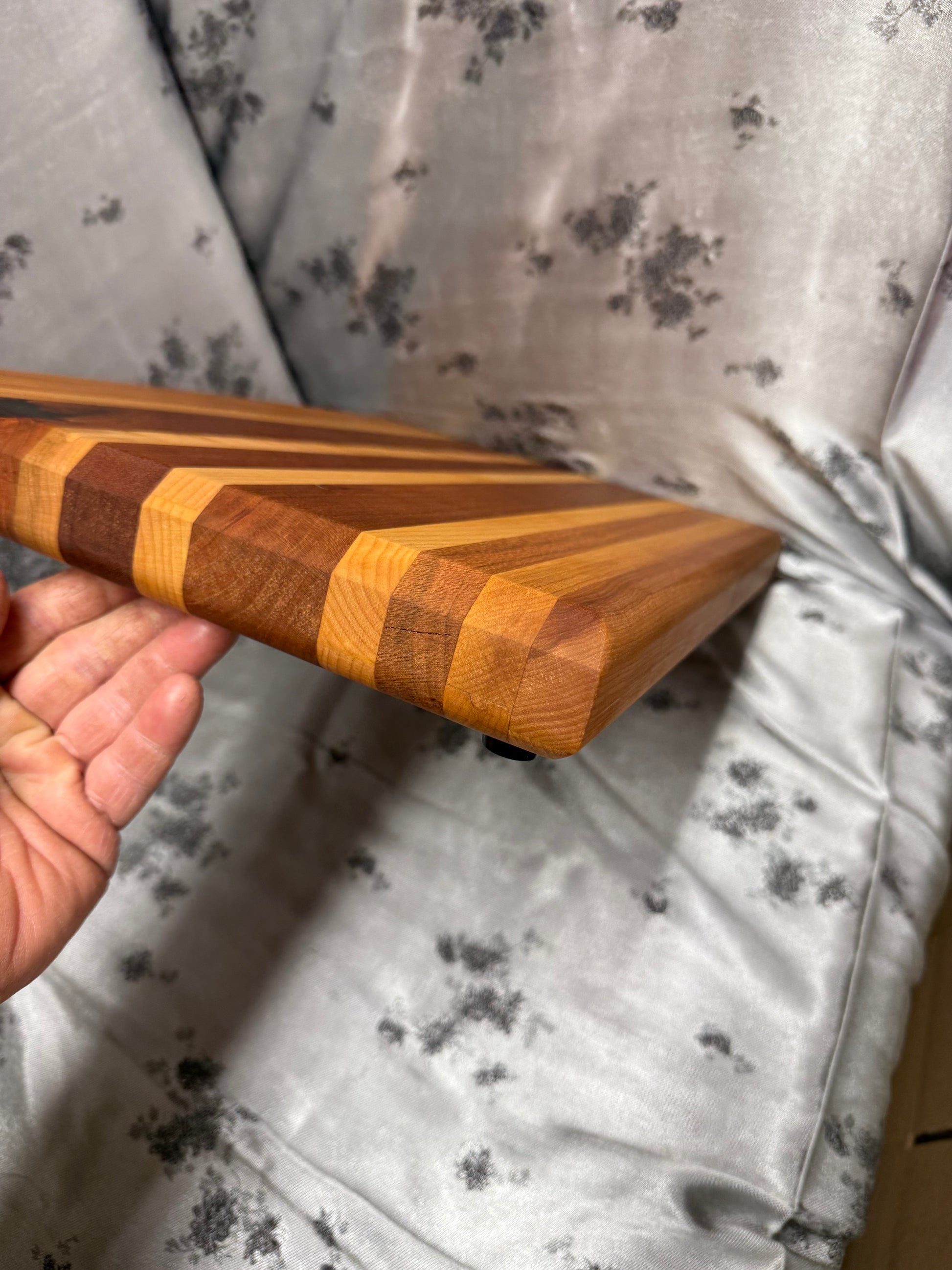 This unique cutting board is crafted from American Cherry and Maple reclaimed from a dresser, end table and kitchen table, featuring beautiful natural wood grain and character with a cool epoxy knot repair showcased. At 7.1 pounds, it offers both elegance and functionality, perfect for both serving and everyday use in any refined kitchen setting. Dimensions: 12 inches by 16-1/4 inches by 1-5/16 inches.