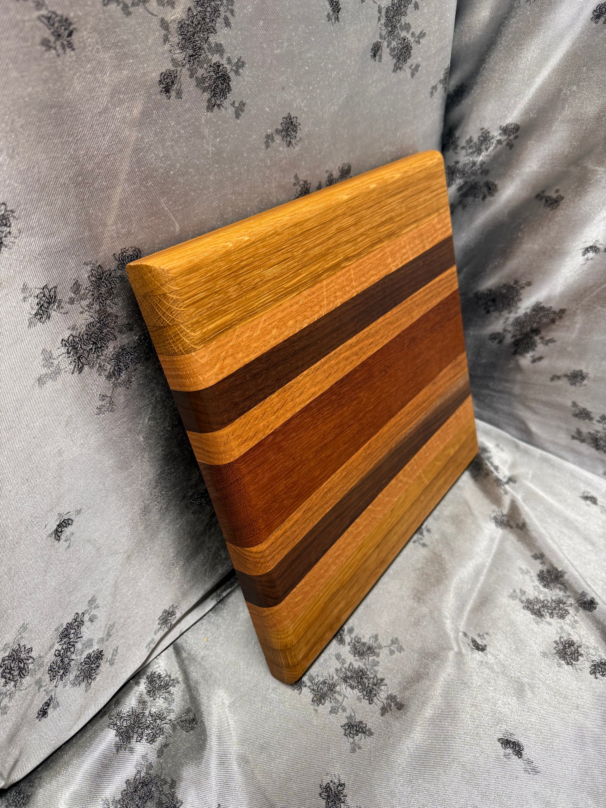 This unique cutting board is crafted from Red Oak, Walnut and African Mahogany reclaimed from a TV stand, shelf and table leg, featuring beautiful natural wood grain and character. At 3.2 pounds, it offers both elegance and functionality, perfect for both serving and everyday use in any refined kitchen setting. Dimensions: 11-1/4 inches by 11-7/8 inches by 1 inch.