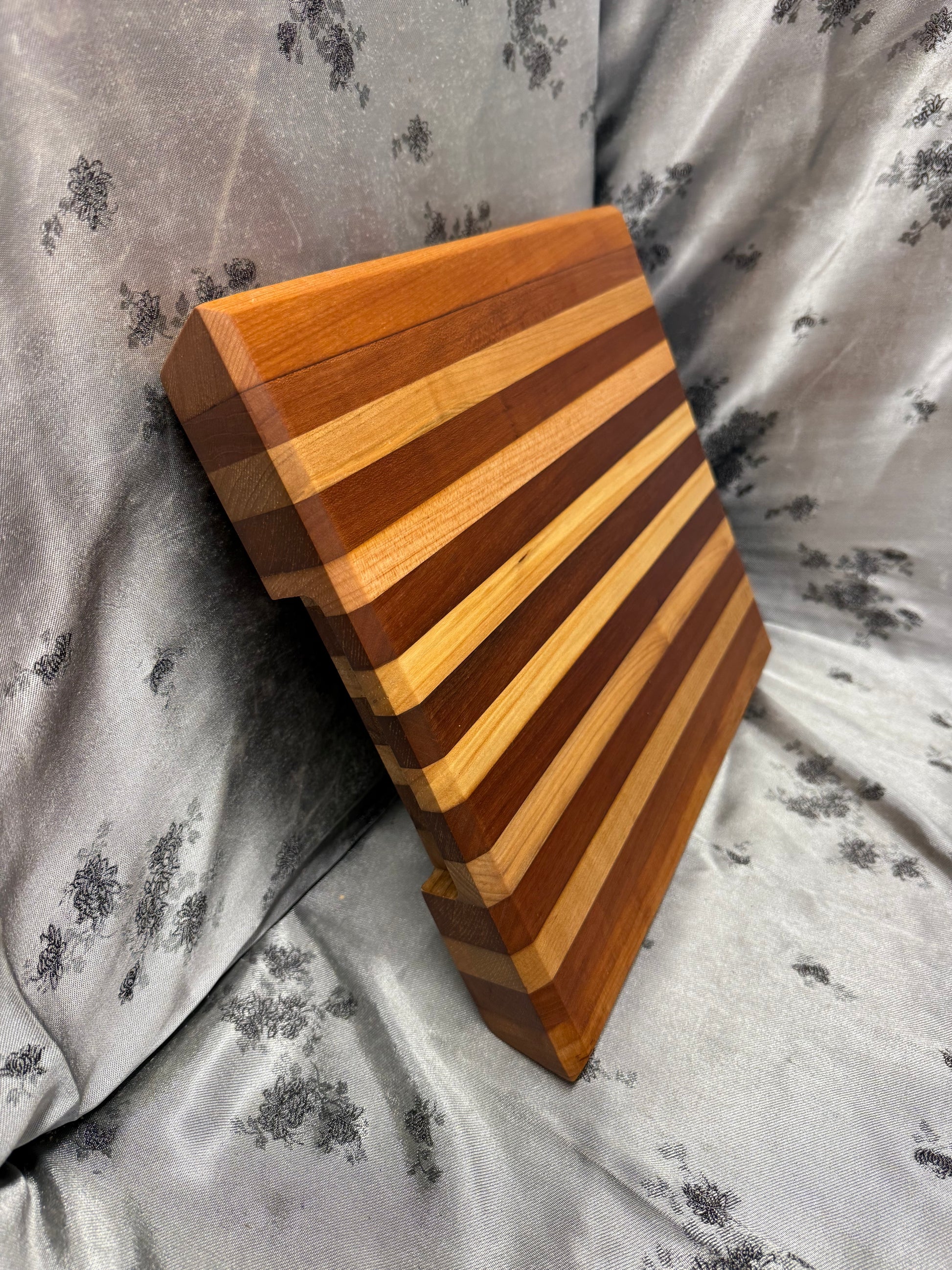 This unique cutting board is crafted from Maple and Brazilian Cherry reclaimed from a kitchen table and dresser, featuring beautiful natural wood grain and character. At 6.2 pounds, this thick board offers both elegance and functionality with handles on all 4 sides and beveled edges, perfect for both serving and everyday use in any refined kitchen setting. Dimensions: 11-1/2 inches by 13-3/4 inches by 1-7/8 inches.