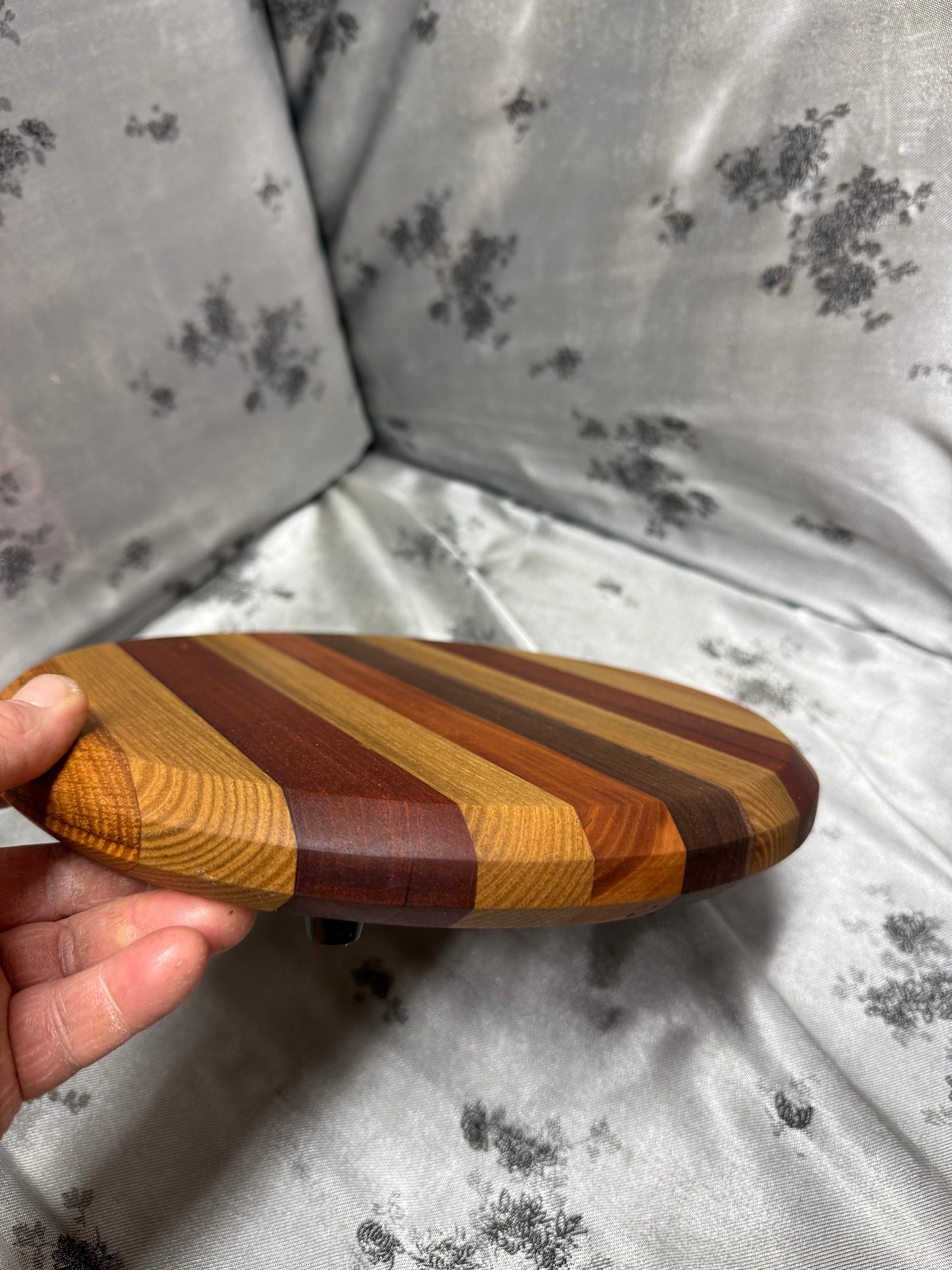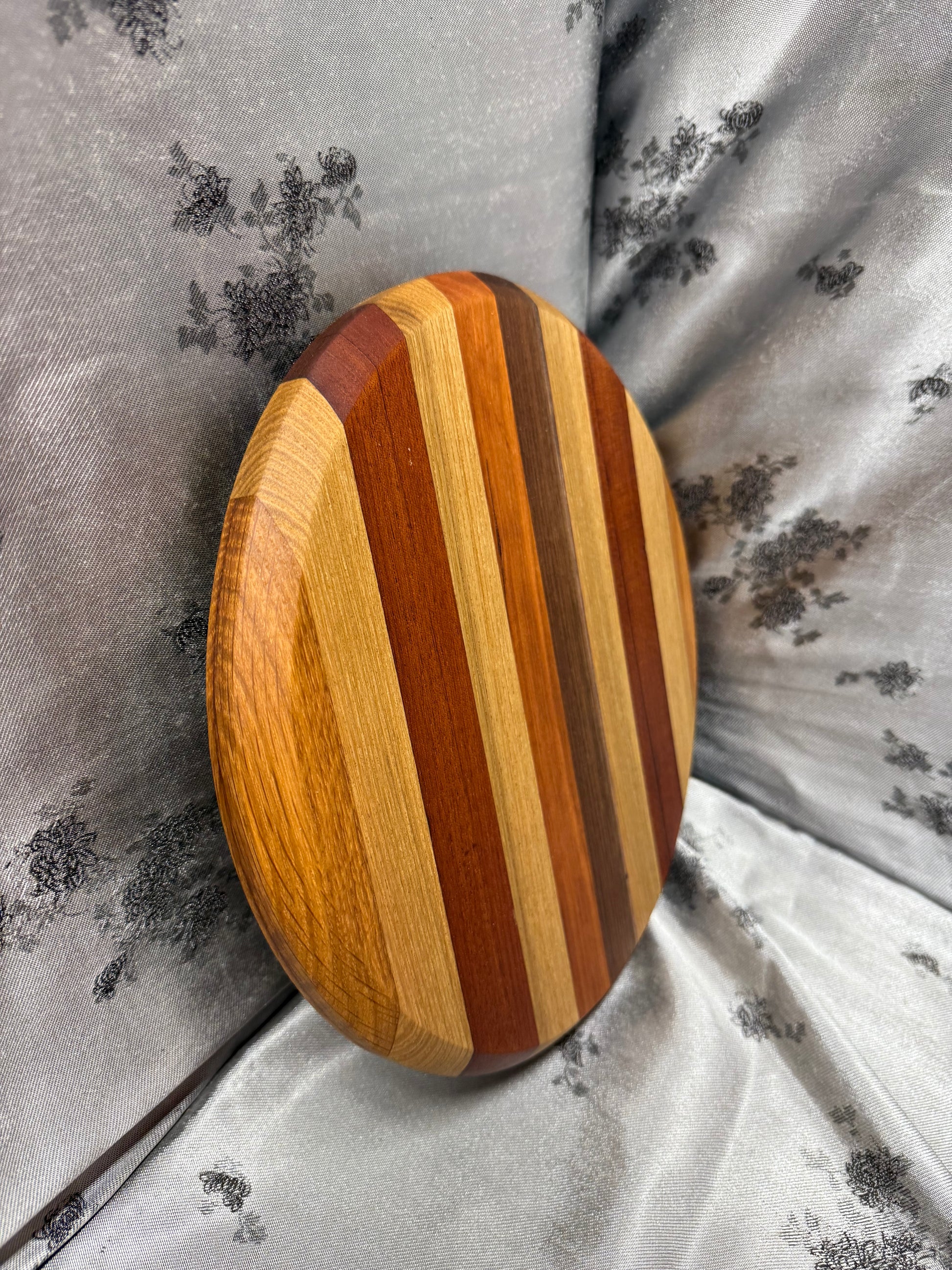 This unique cutting board is crafted from Red Oak, Indian Mahogany, American Cherry and Walnut reclaimed from a desk, table leg, dresser and end table, featuring beautiful natural wood grain and character. At 1.9 pounds, it offers both elegance and functionality with barrel-top edges, perfect for both serving and everyday use in any refined kitchen setting. Dimensions: 10-1/2 inches round.