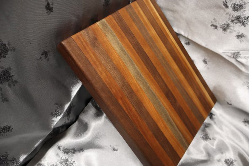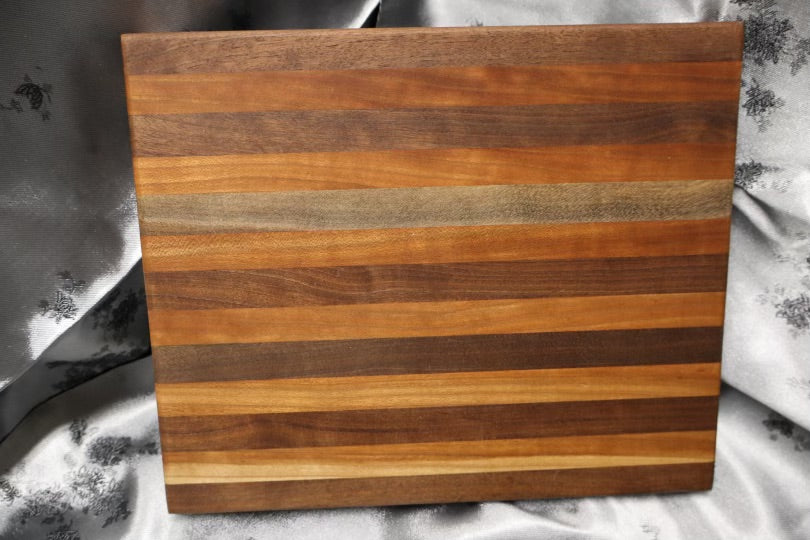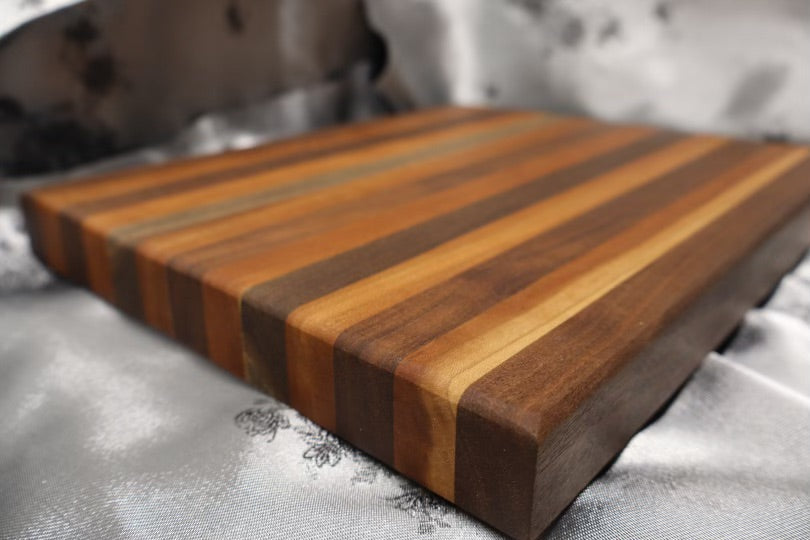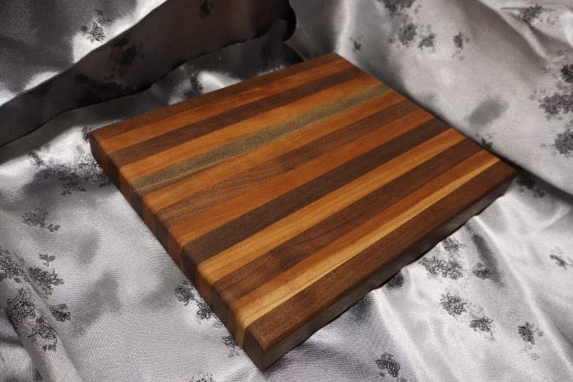 This beautiful board is made from an old shelf and dresser. It contains Walnut, and American cherry wood, making this one particularly rare. It's dimensions are 9-1/2” x 11-1/2” x 1-1/8”.
