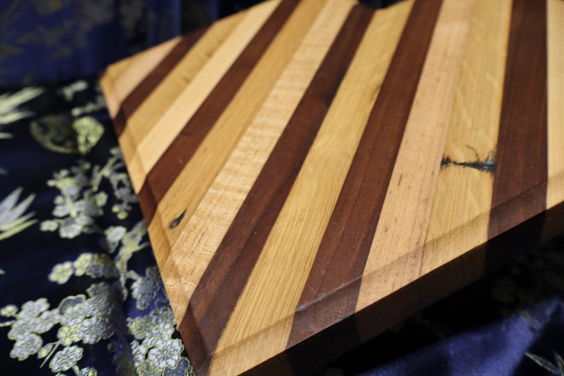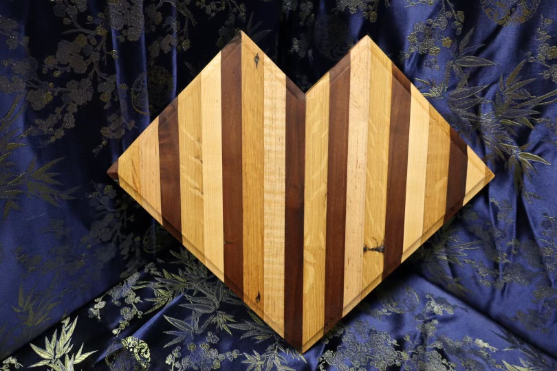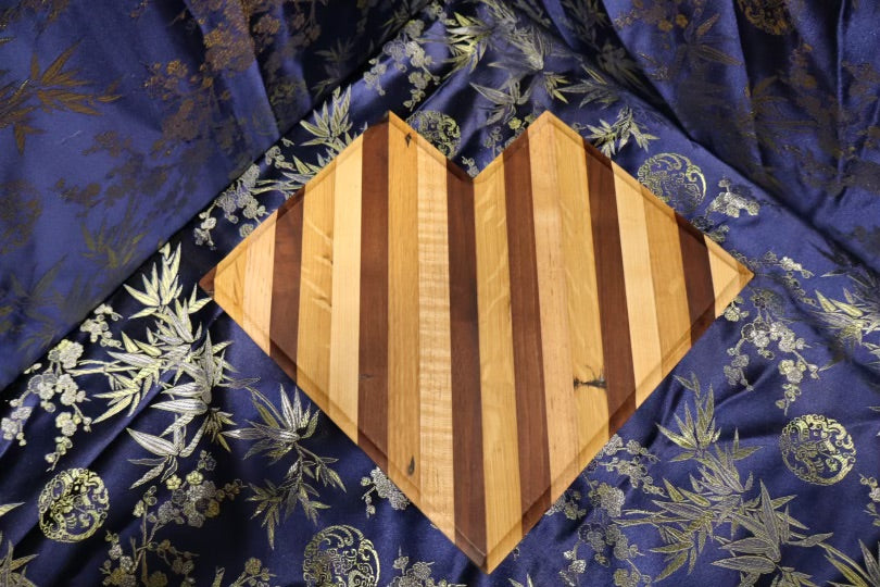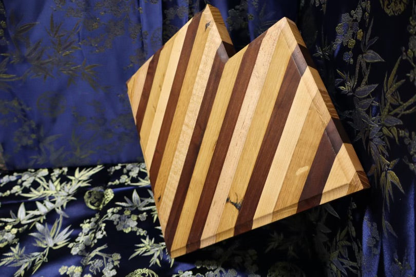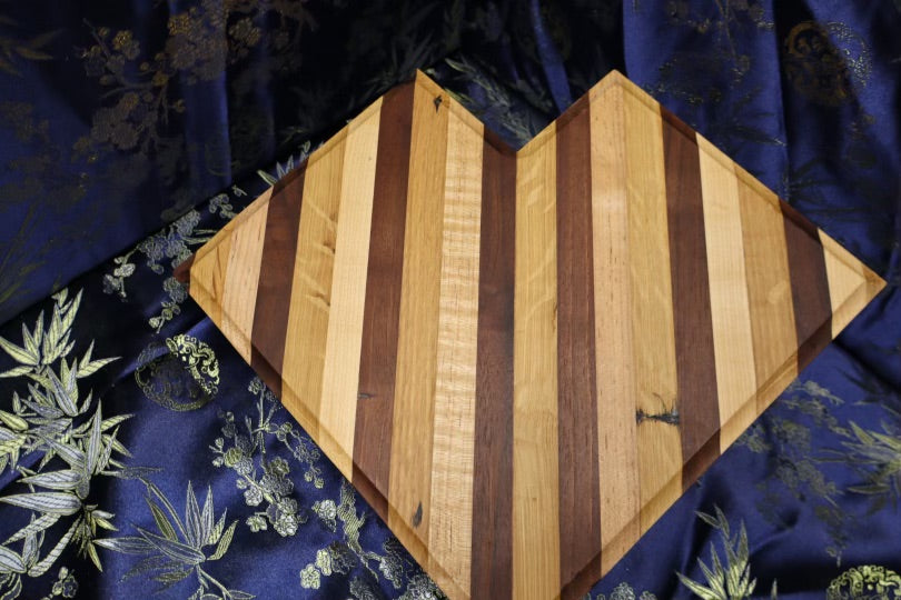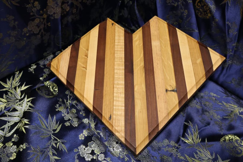 This heart shaped, unique board is made from old cabin panelling. It consists of white oak, maple, and walnut wood. Suitable for all kitchen uses, this board's dimensions are 10" x 10-1/4" x 1-3/8".