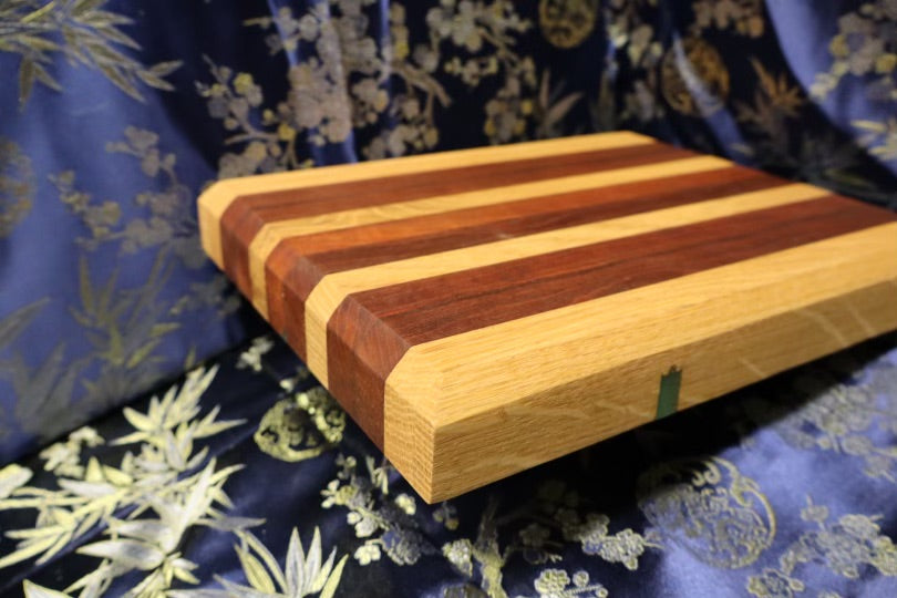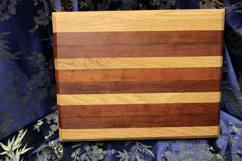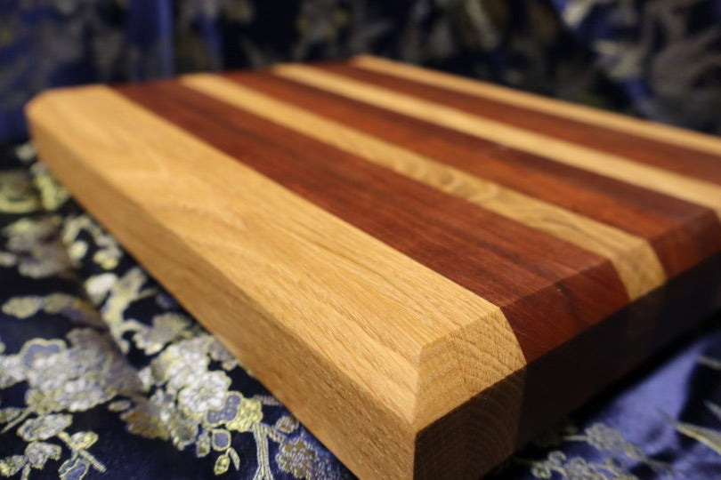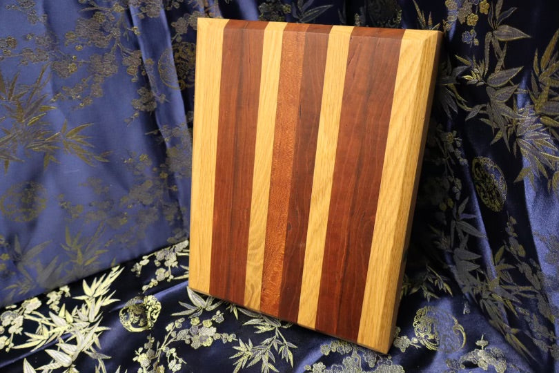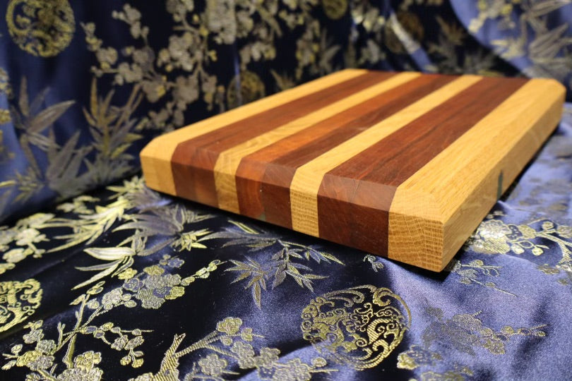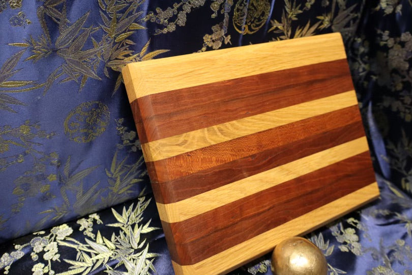 This small, but versatile cutting board is easily transportable, and was made from an end table and dresser. Is consists of White oak, and American cherry wood, and can be used for most cooking applications, although it is slightly limited due to its size. Perfect for a gift! It's dimensions are 8-1/2” x 11-3/4” x 1-3/8”.