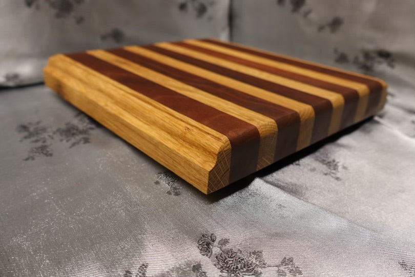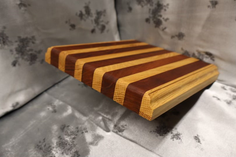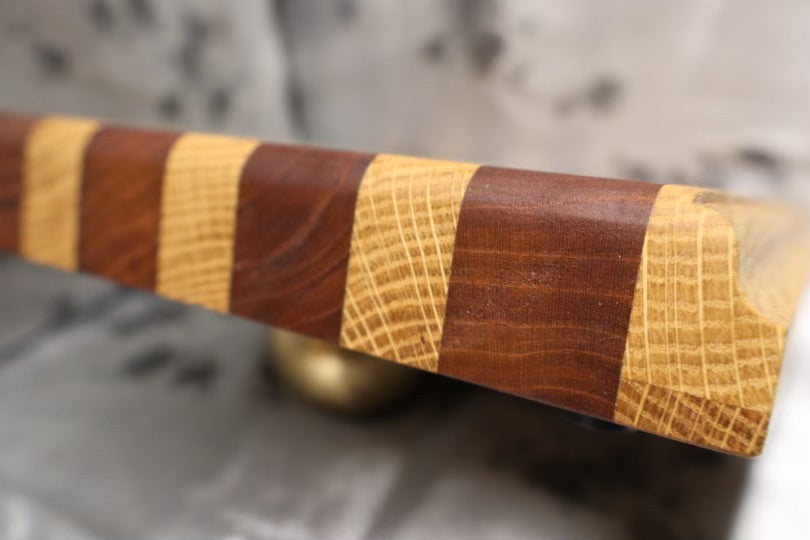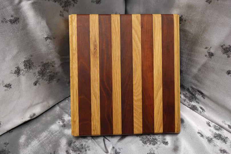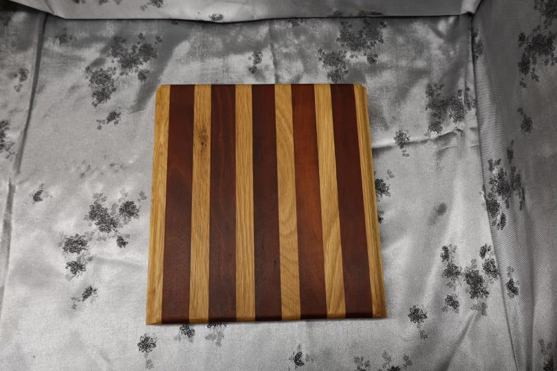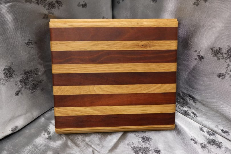 This beautiful, grainy, and natural looking board features crowned edges, with stripes of cherry wood. It was made form an End table, and a Dresser. It consists of White oak, and cherry as mentioned before. It's dimensions are 9” x 9-5/8” x1-3/-6”.