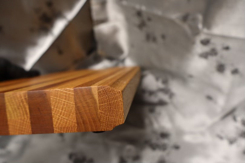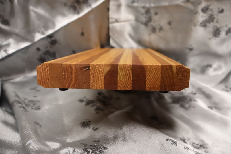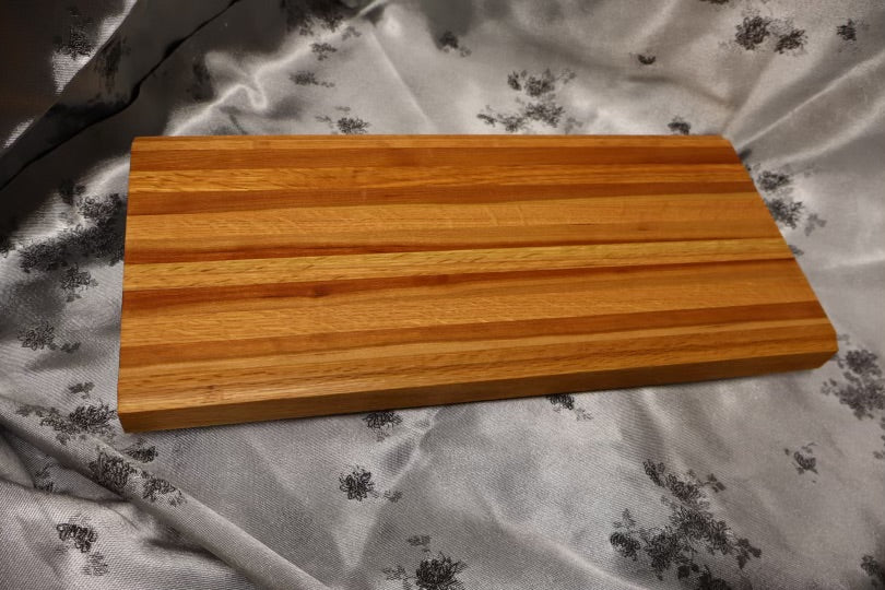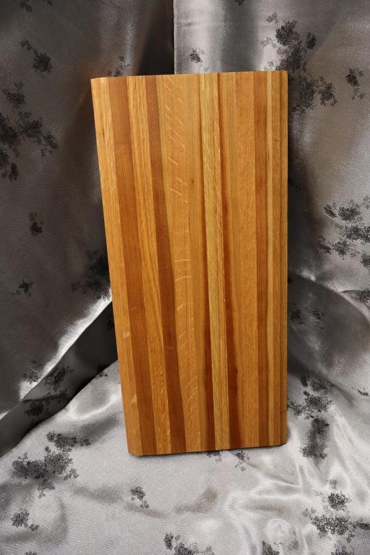 This large, rectangular board is perfect for charcuterie presentations, or just basic kitchen needs. It is made from an old coffee, and end table, and is comprised of Red oak and American cherry wood, ad it's dimensions are 7-1/4” x 16” x 1-1/4”.