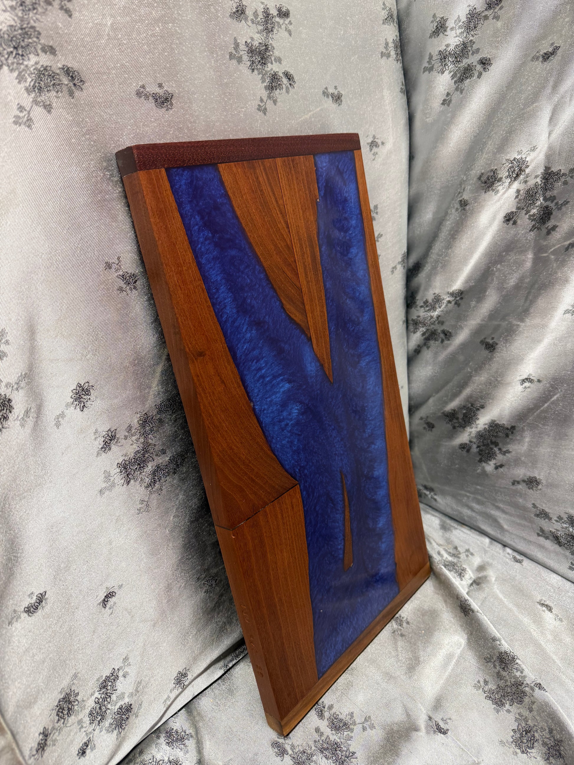 This stunning charcuterie board is crafted from Brazilian Cherry and Red Meranti reclaimed from a dresser and flooring, featuring beautiful natural wood tones and grain patterns. At 4.8 pounds, it offers both elegance and functionality with eye-catching epoxy river accents. This unique flippable board showcases a blue river on one side and a red and gold river on the other, giving you two distinct looks for entertaining. Perfect for serving charcuterie, cheeses, and appetizers in any refined setting. Dimensions: 9-1/2 inches by 18-1/4 inches by 3/4 inch.