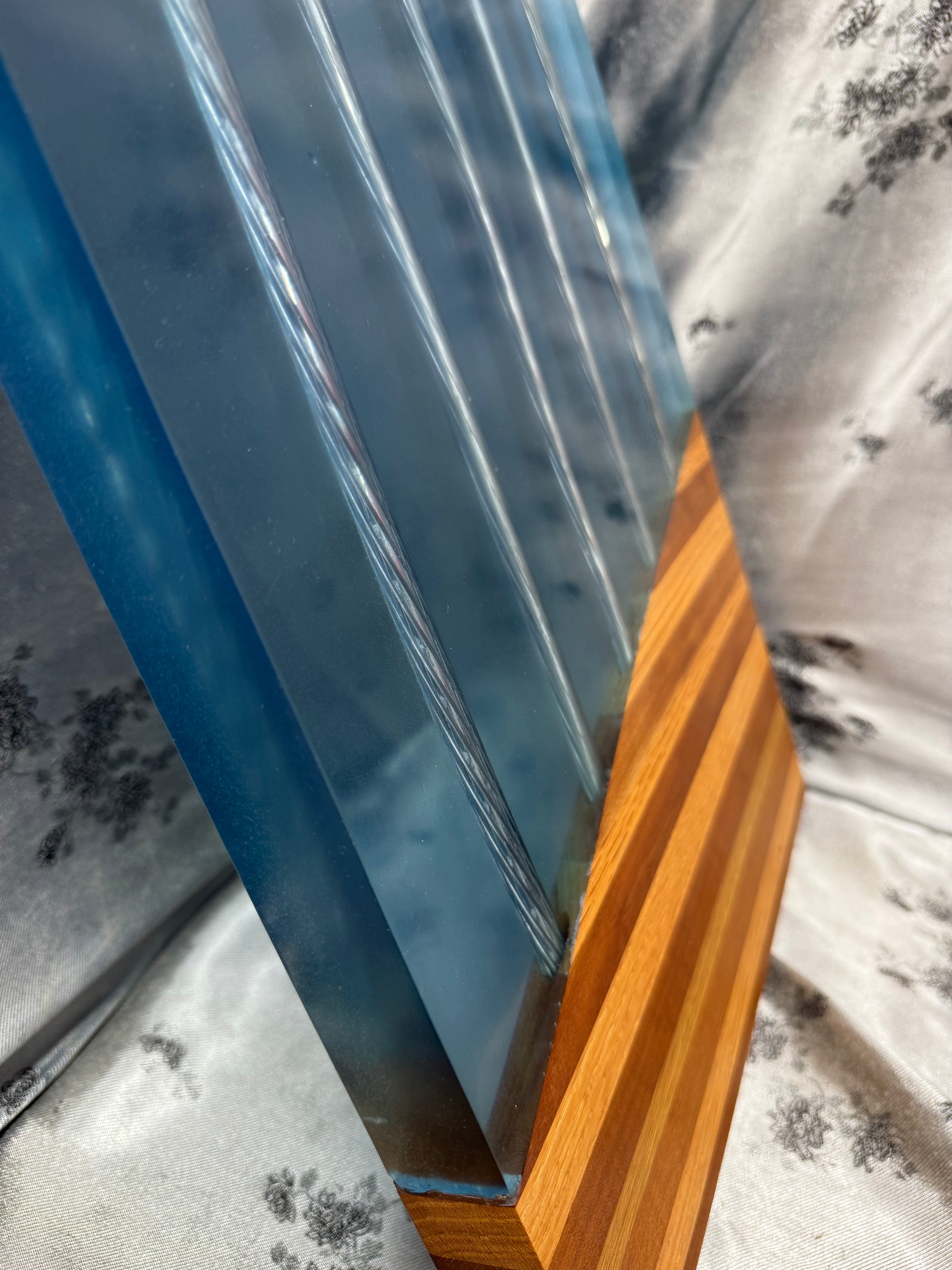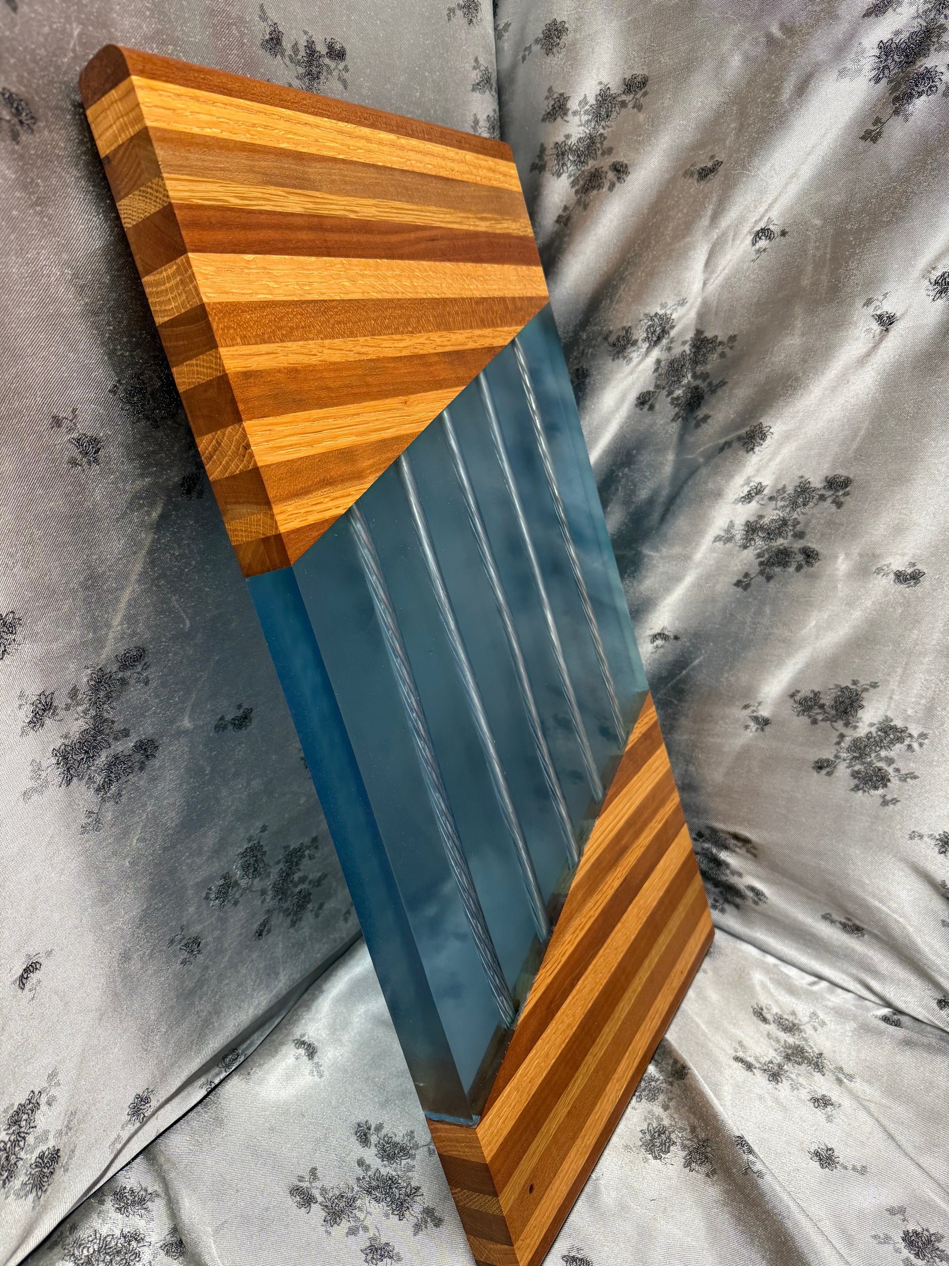 This stunning charcuterie board is crafted from Red Oak, White Oak, and American Cherry reclaimed from kitchen tables and a dresser, featuring beautiful natural wood tones and grain patterns. At 10.5 pounds, it offers both elegance and substantial presence with a unique light blue see-through epoxy accent embedded with #00 aluminum wire for an artistic touch. Perfect for serving charcuterie, cheeses, and appetizers in any refined setting. Dimensions: 11-3/4 inches by 22-1/4 inches by 1-1/8 inches.