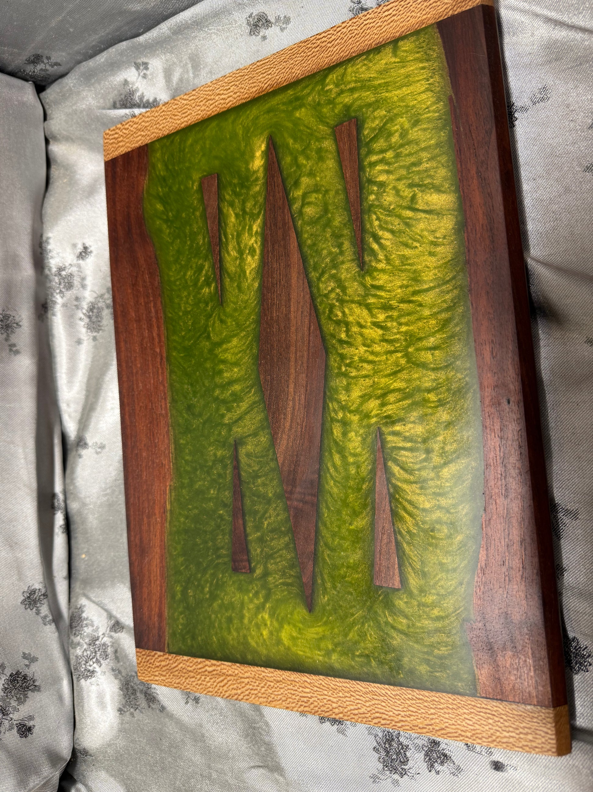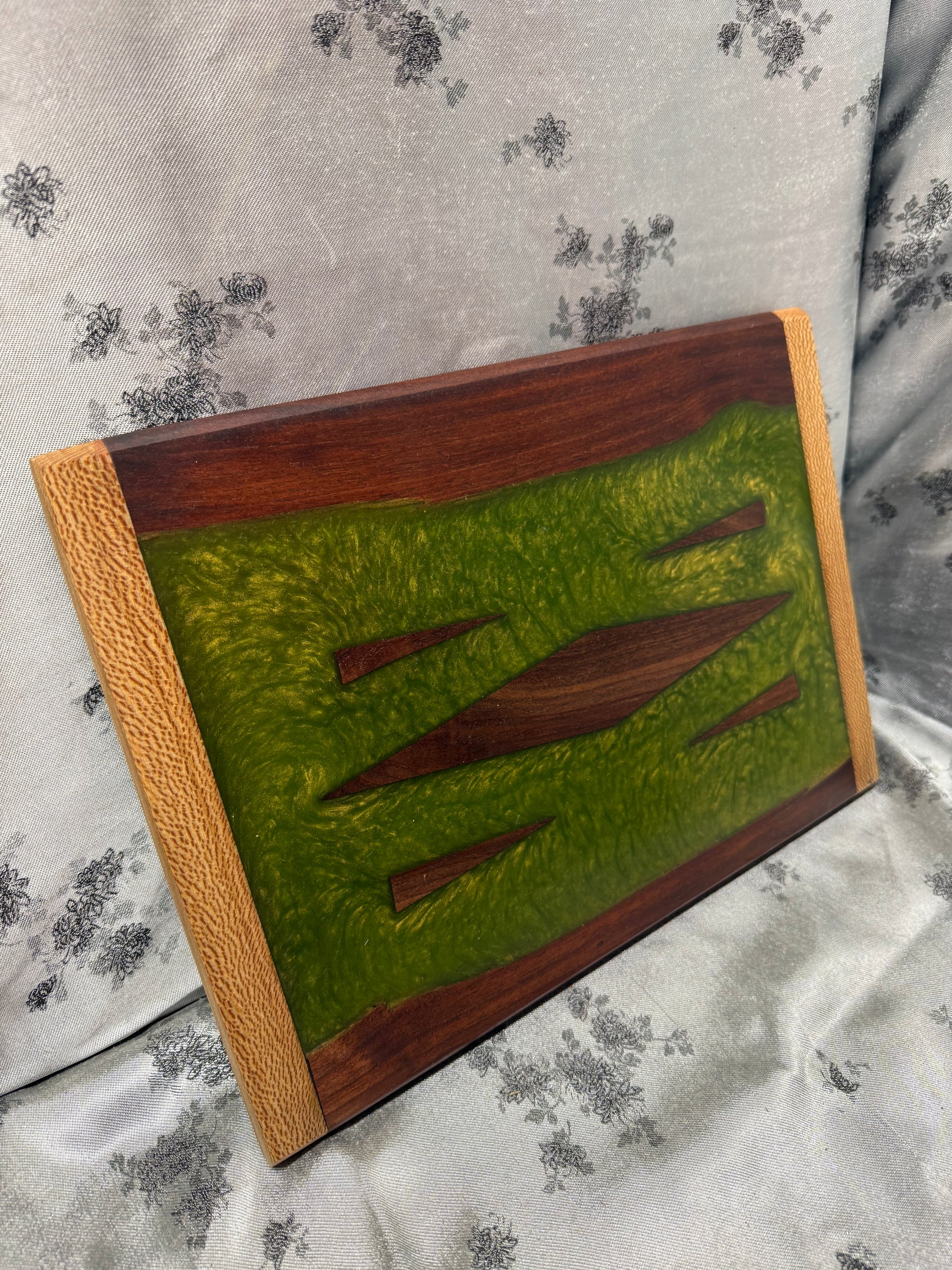 This unique charcuterie board is crafted from Black Walnut and Bird's Eye Maple reclaimed from estate sale wood and a desk, featuring beautiful natural wood grain and character. At 3 pounds, it offers both elegance and functionality with a shimmering green swirl epoxy design, making it perfect for both serving charcuterie and everyday use in any refined kitchen setting. Dimensions: 10 inches by 14 inches by 5/8 inch.