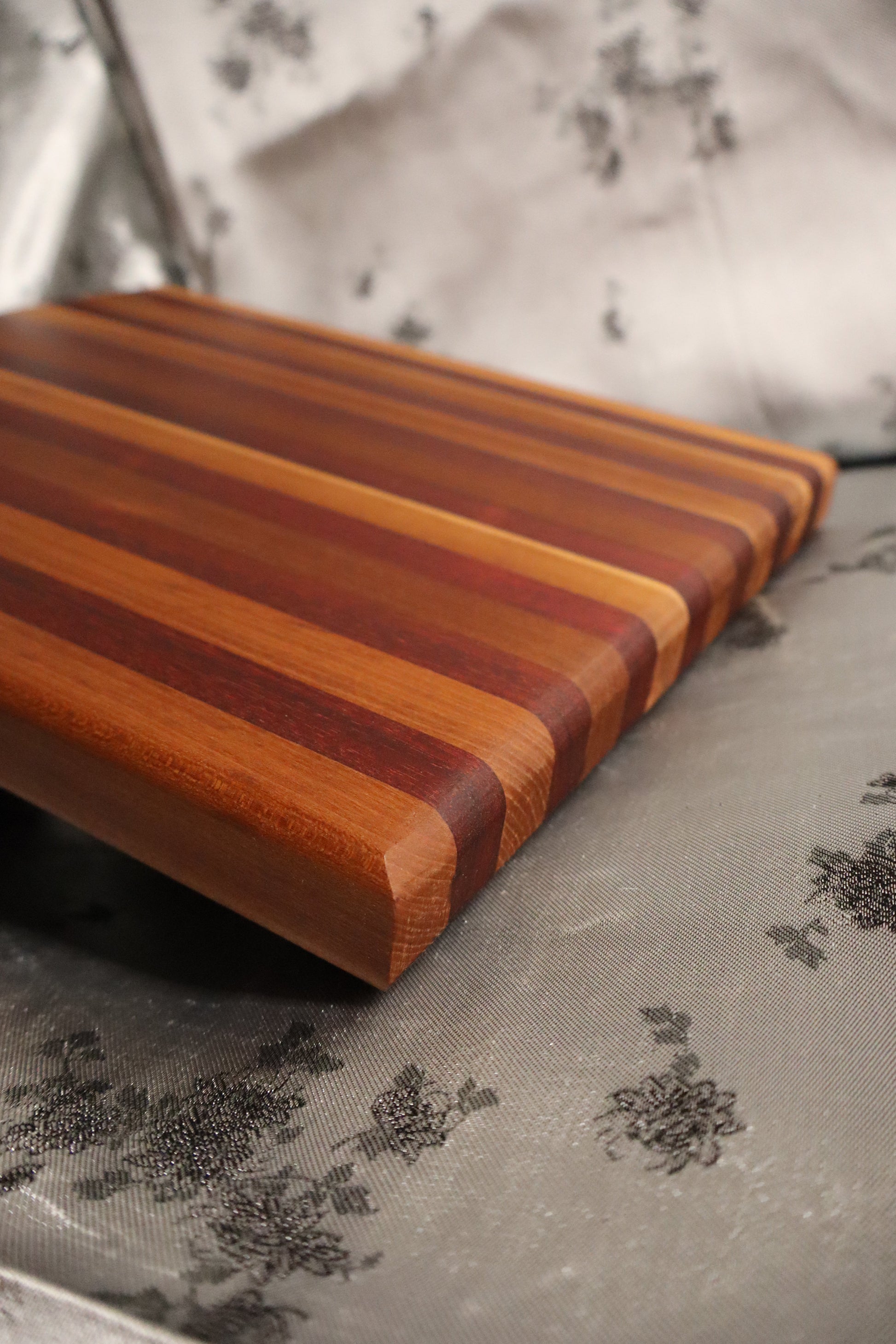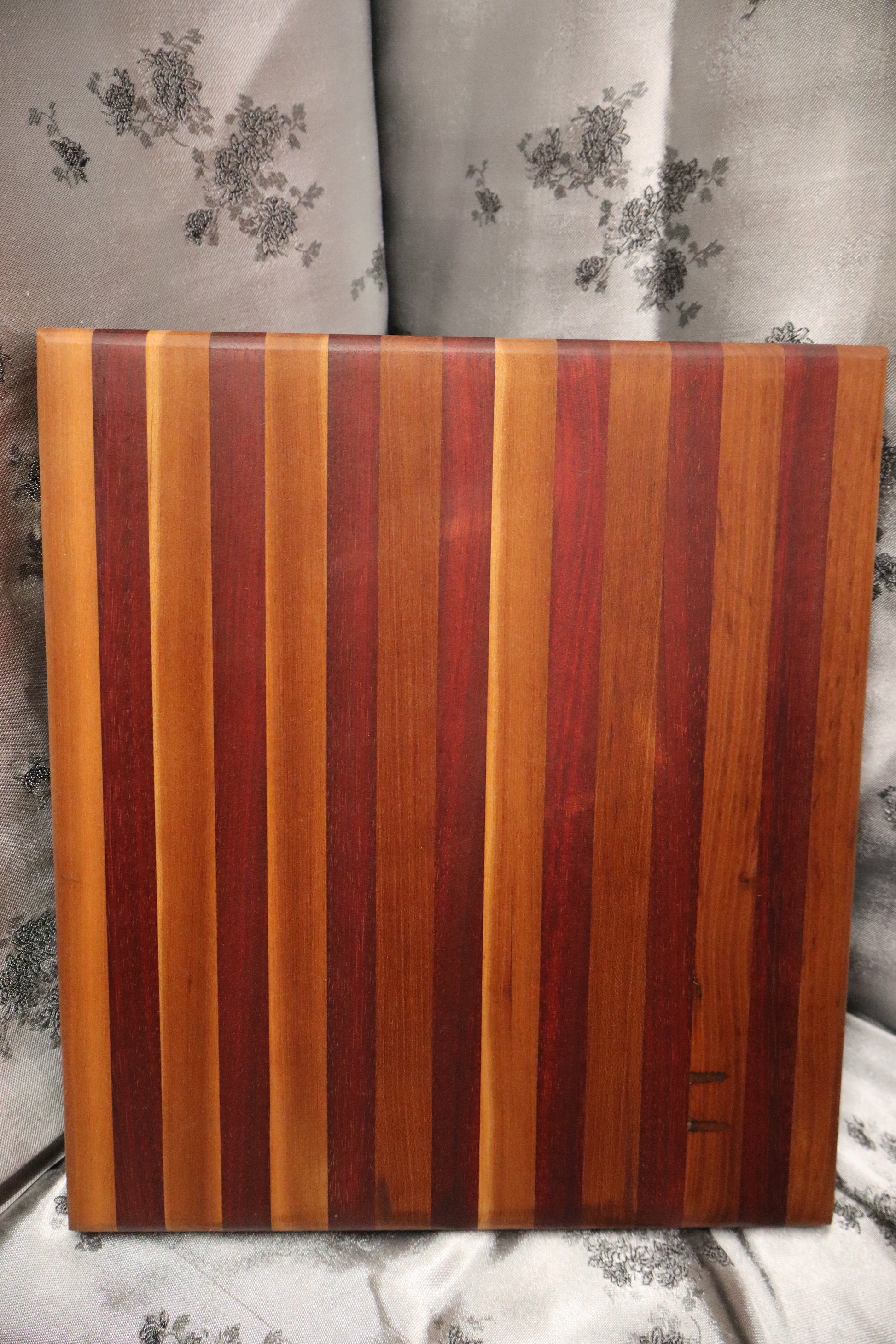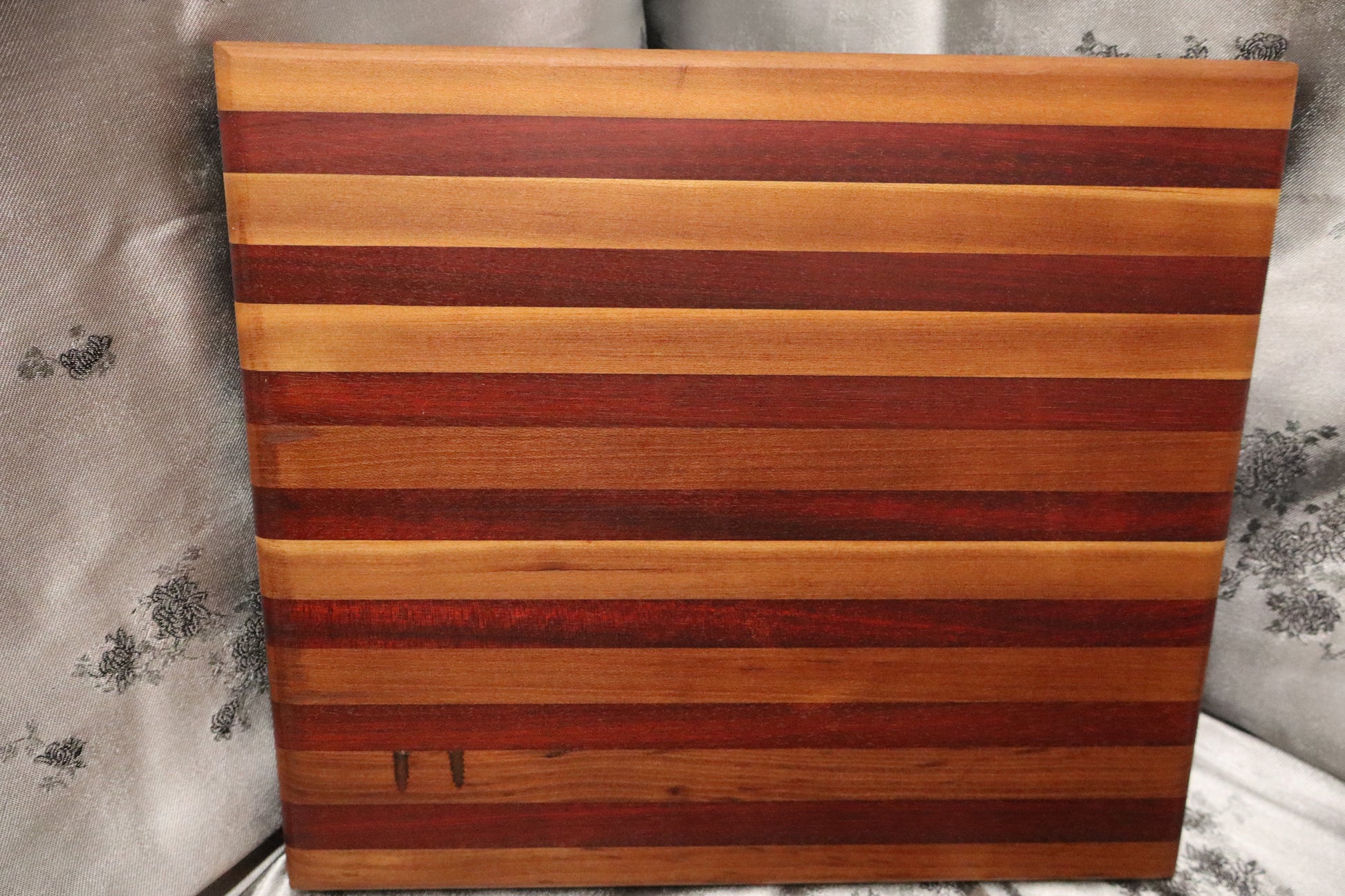 This beautiful, exotic looking Red Oak, American Cherry and Red Meranti board is a absolute stunner. It's made from a mix of luxurious, ad rare woods, Red Meranti in particular being extremely rare to find. - 11-1/2” x 13” x 1-1/4” dimensions – made from a dresser and unused flooring.