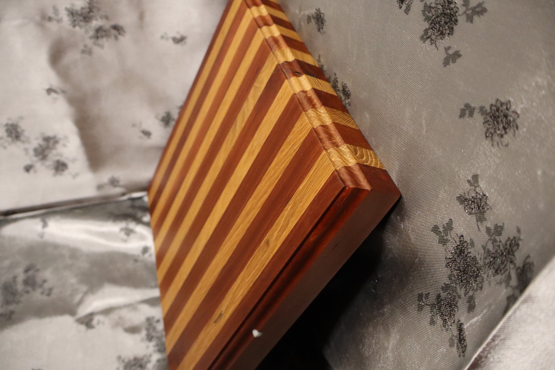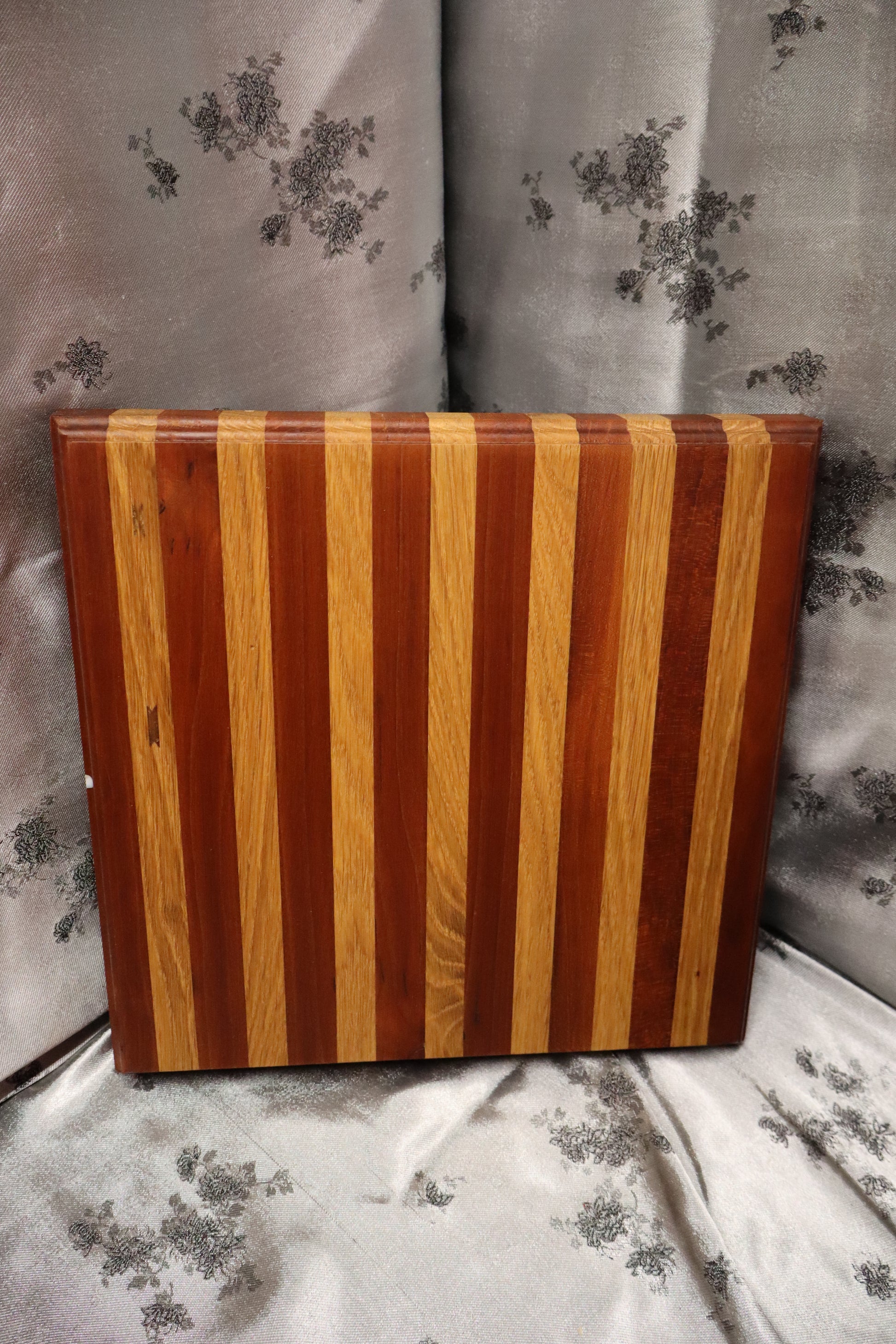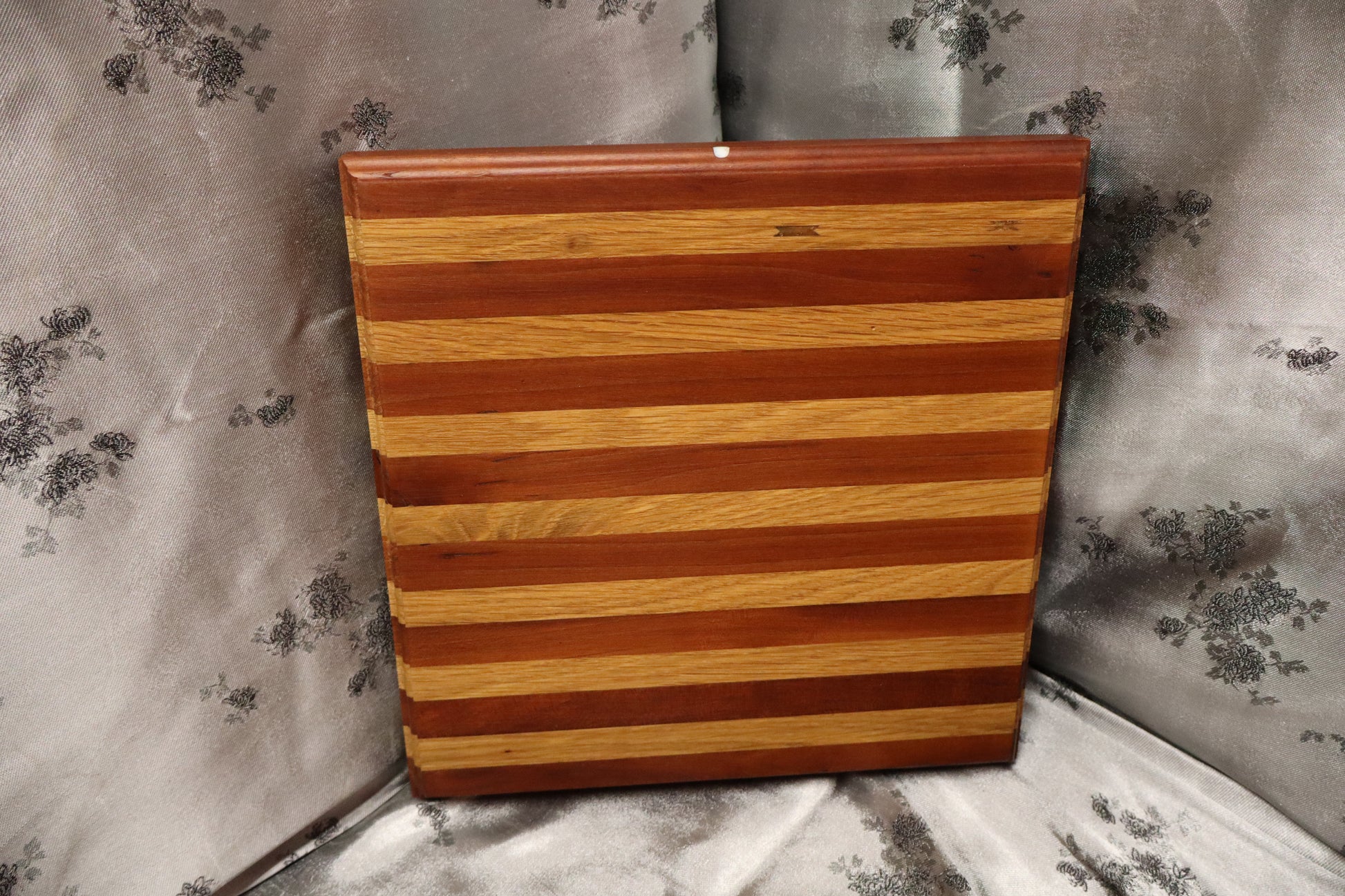 This Red Oak and American Cherry board is sure to make your kitchen look beautiful with it's rustic charm! it's ogee edges and vibrant oak grain stand out amazingly. – 11-1/2” x 11-1/2” x 1-1/4” dimensions – made from dressers Ogee edges and popping oak grain