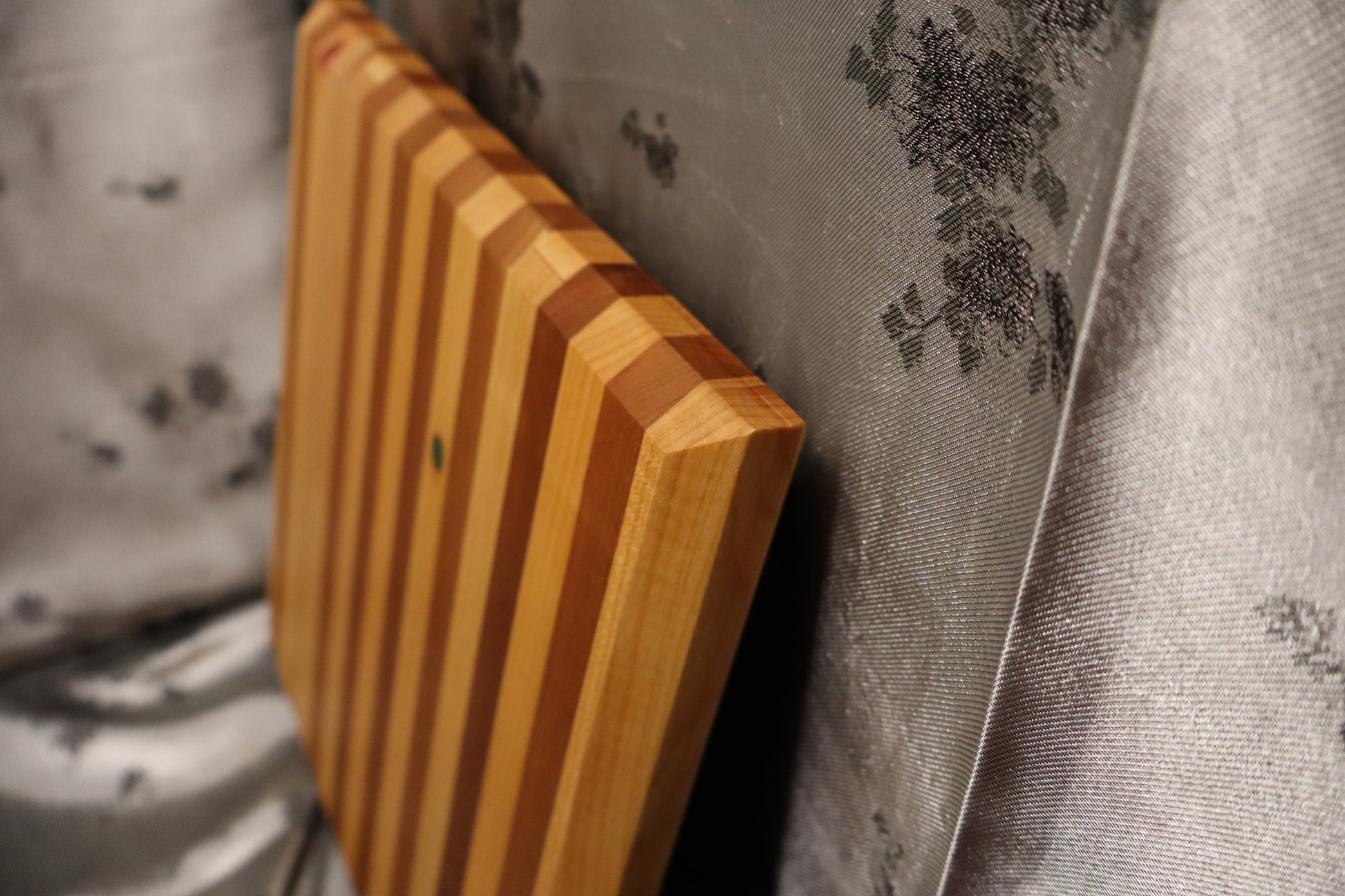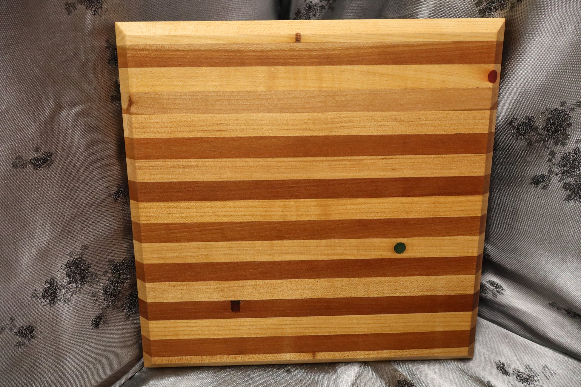 This American Cherry and Maple board has cool chamfered edges, and colorful epoxy repairs which give it a handmade charm! – 11-1/2” x 11-5/8” x 1-1/4” dimensions – made from a dresser and end table.