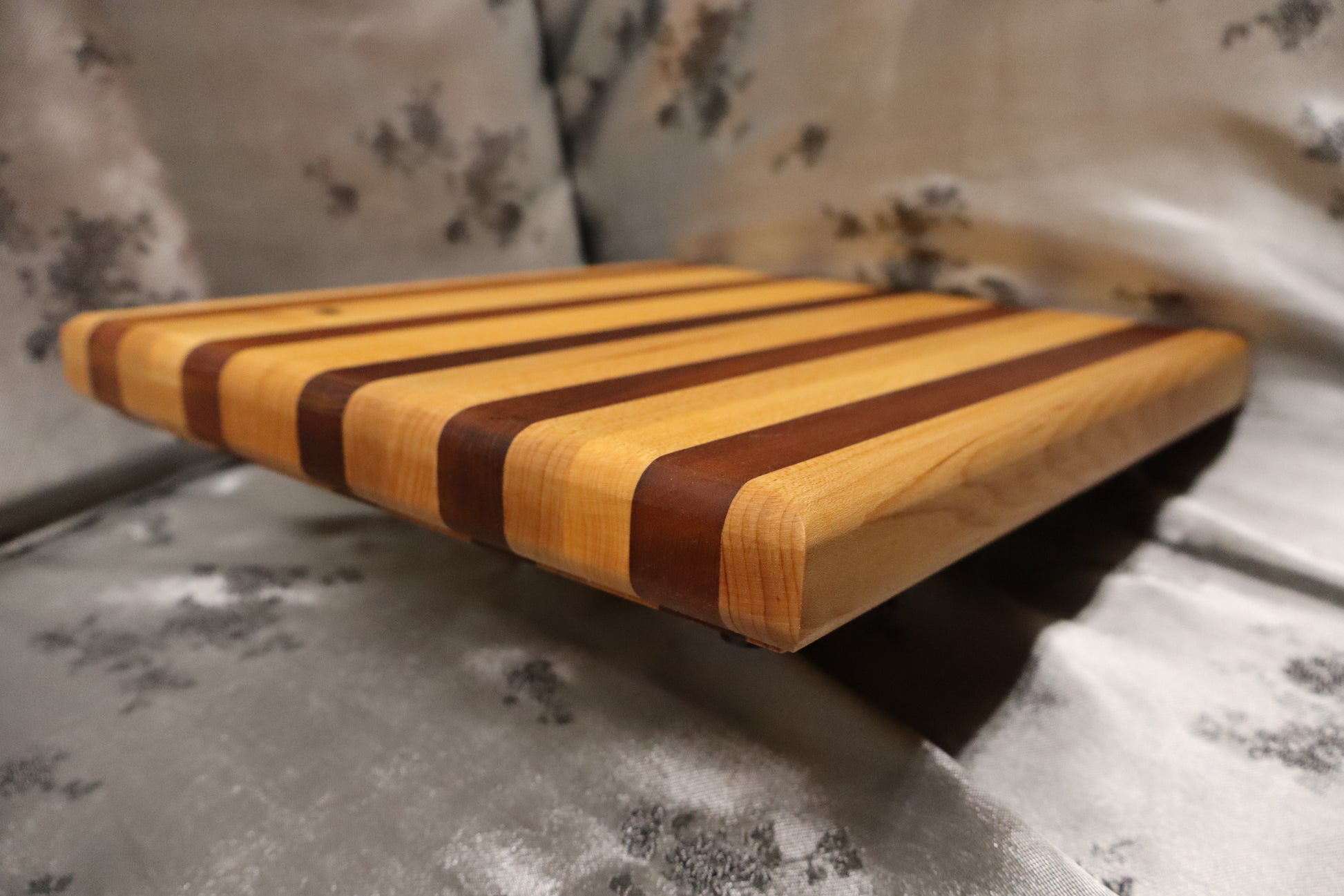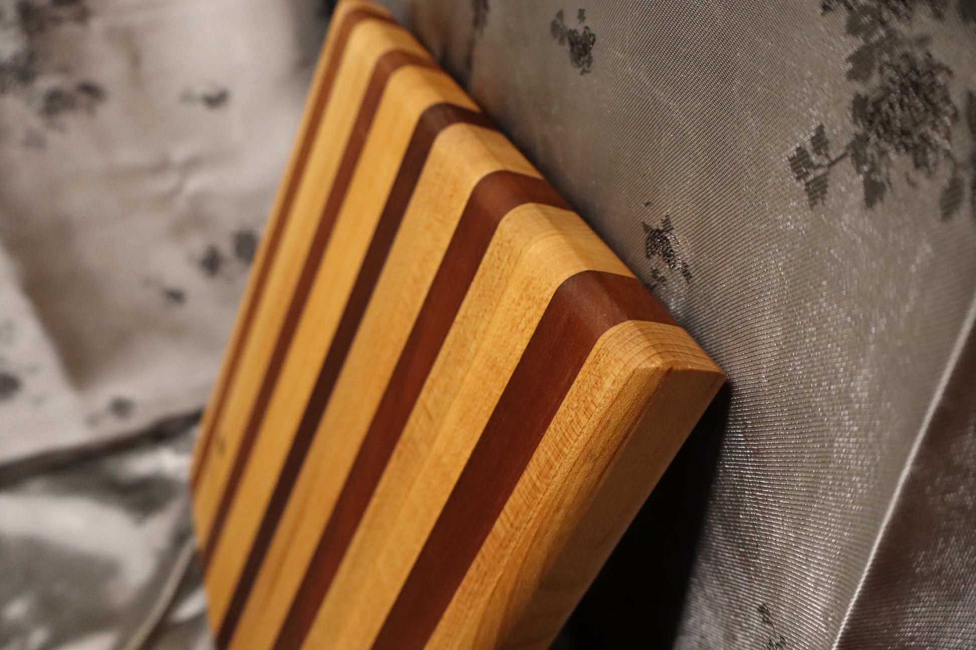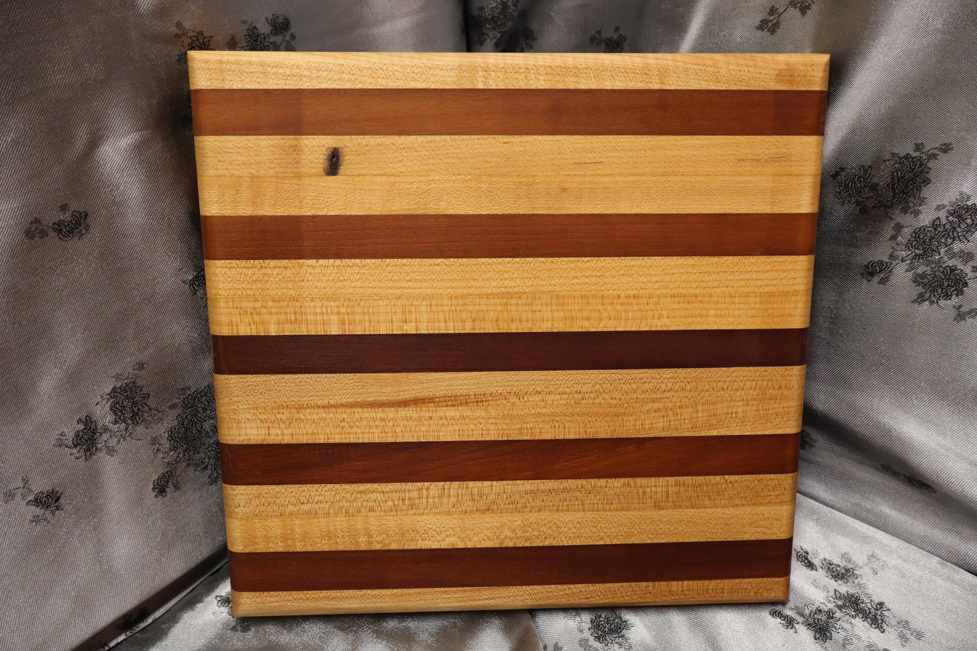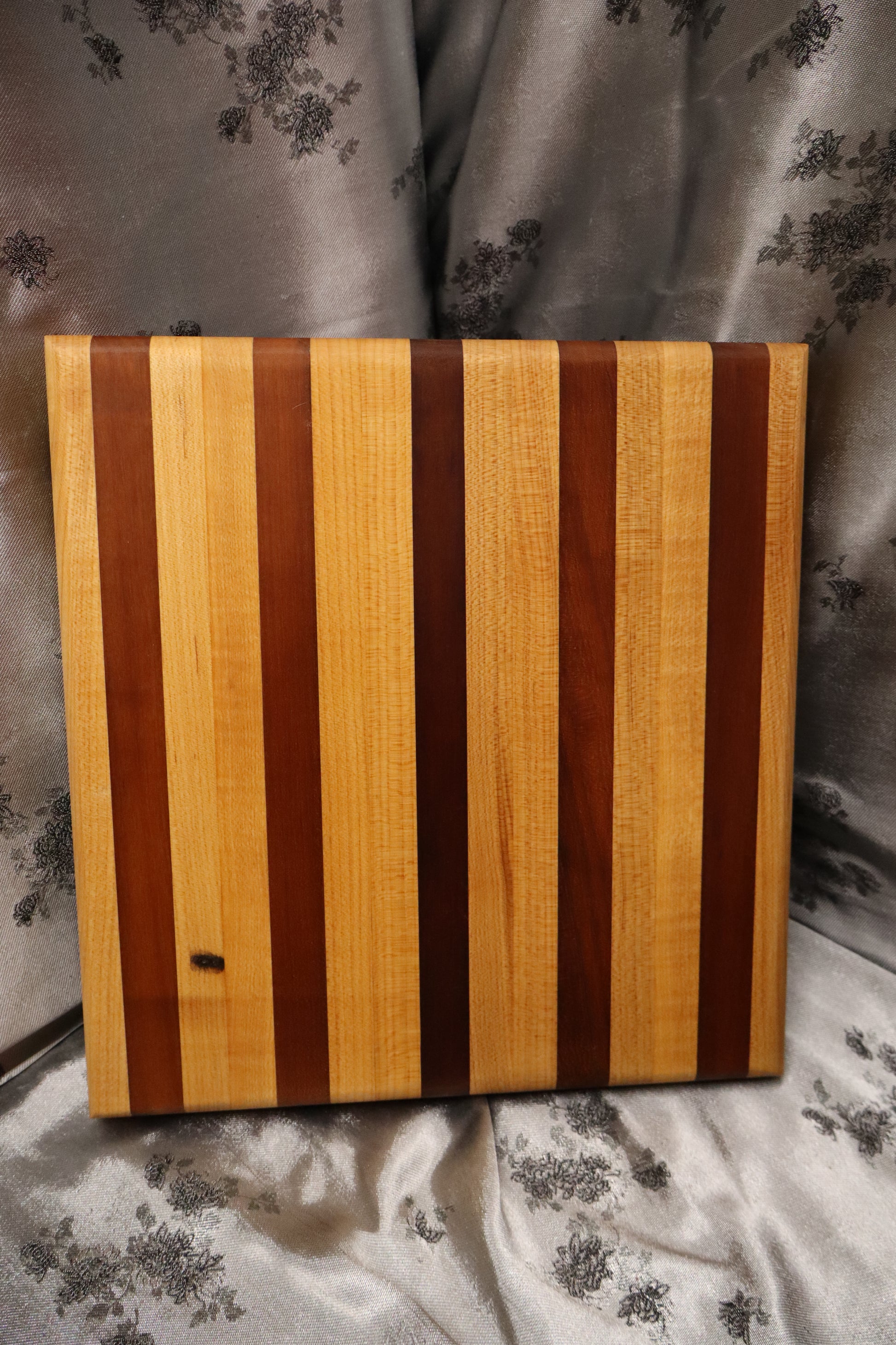 This gorgeous Brazilian Cherry and Maple board has an amazing contrast with light and dark strips of wood! perfect for all foods, ad kitchen applications. – 11” x 11-5/8” x 1-1/4” dimensions – Made from end and kitchen table
