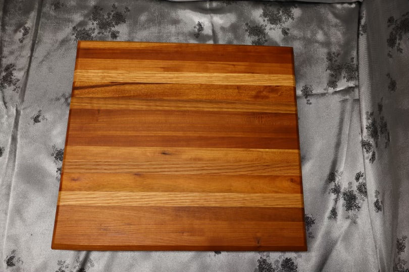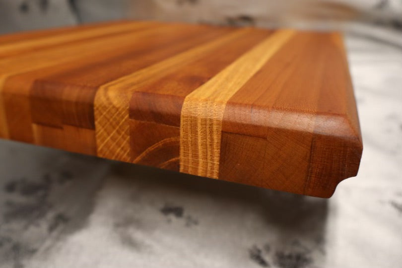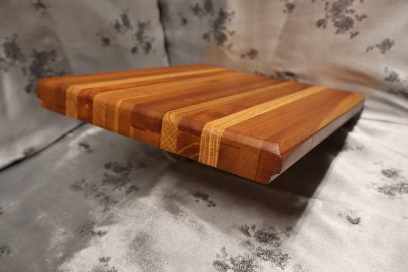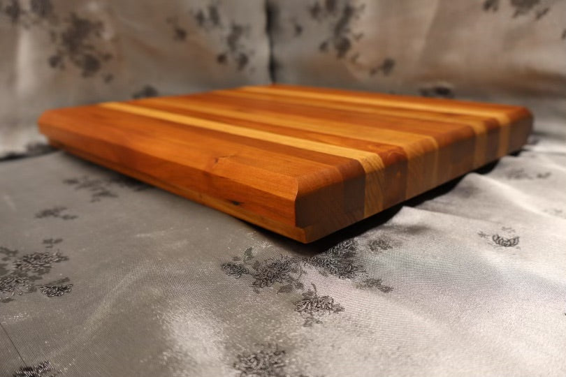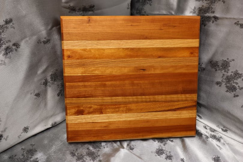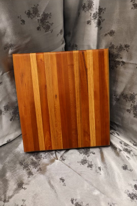 This auburn, autumnal, and absolutely stunning board is made from an old dresser, and consists of American cherry wood and Red oak. It's dimensions are 11-1/4” x 12-1/2” x 1-1/4”.