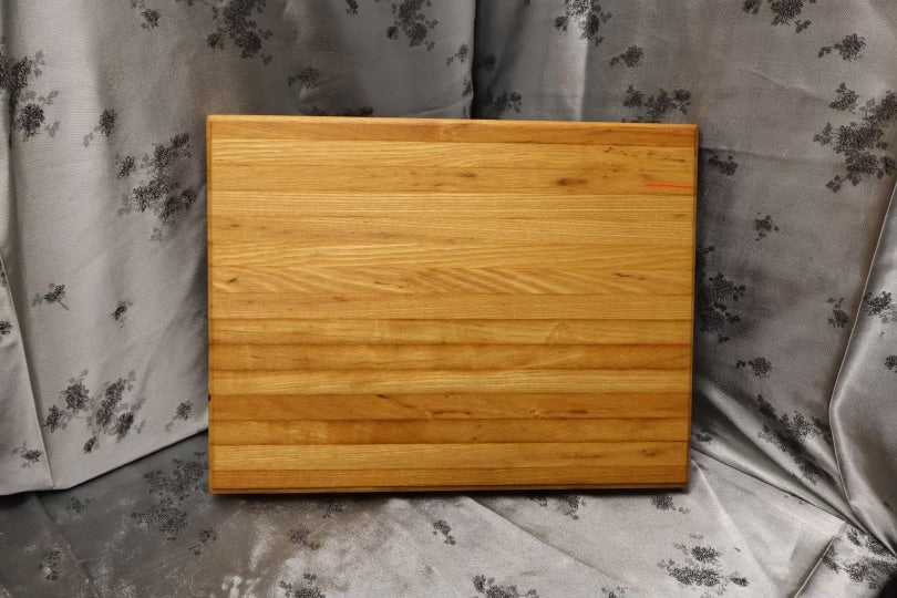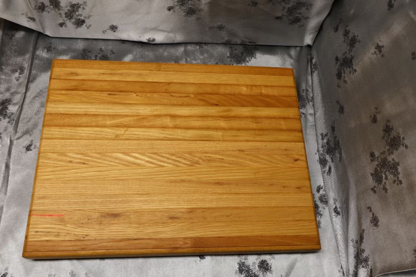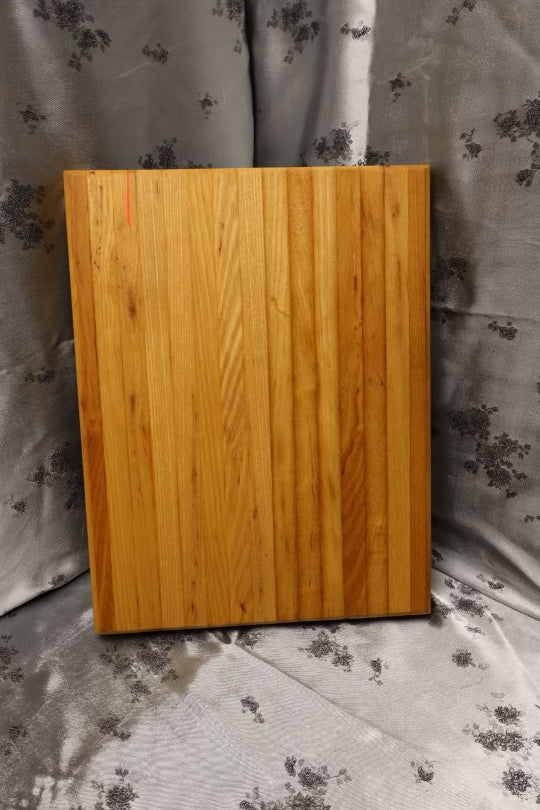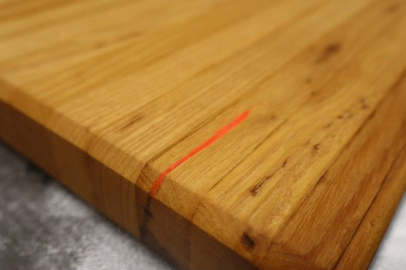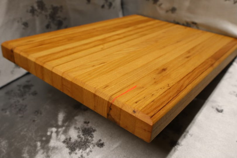 This board is a statement piece. It blends art, with functionality as it features solely red oak, and stylish resin repairs which add a fiery pop of much needed color. Red oak is particularly hard to come by in furniture, so this board is a unique one. It's dimensions are 12-3/8” x 16-1/4” x 1-3/8”.