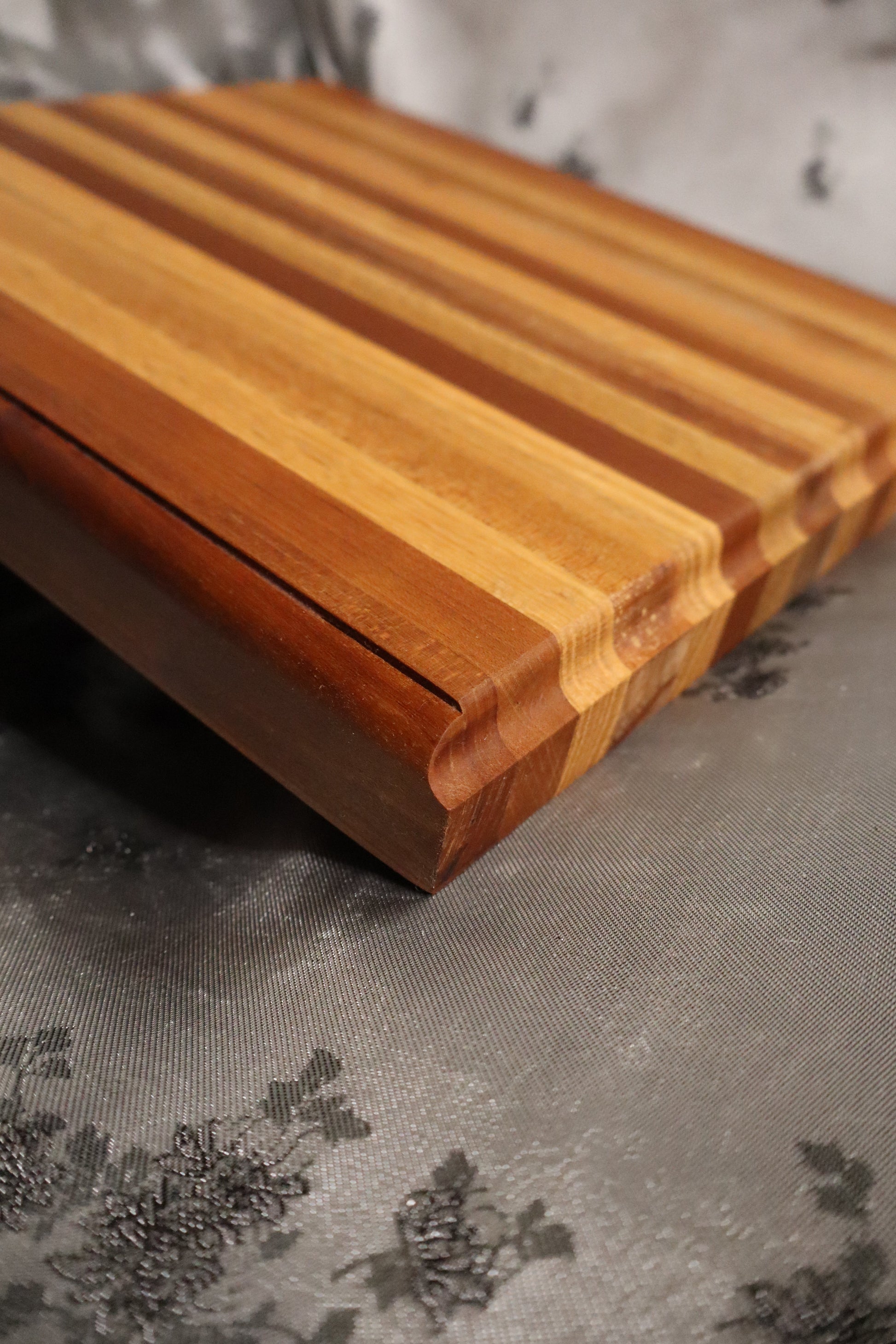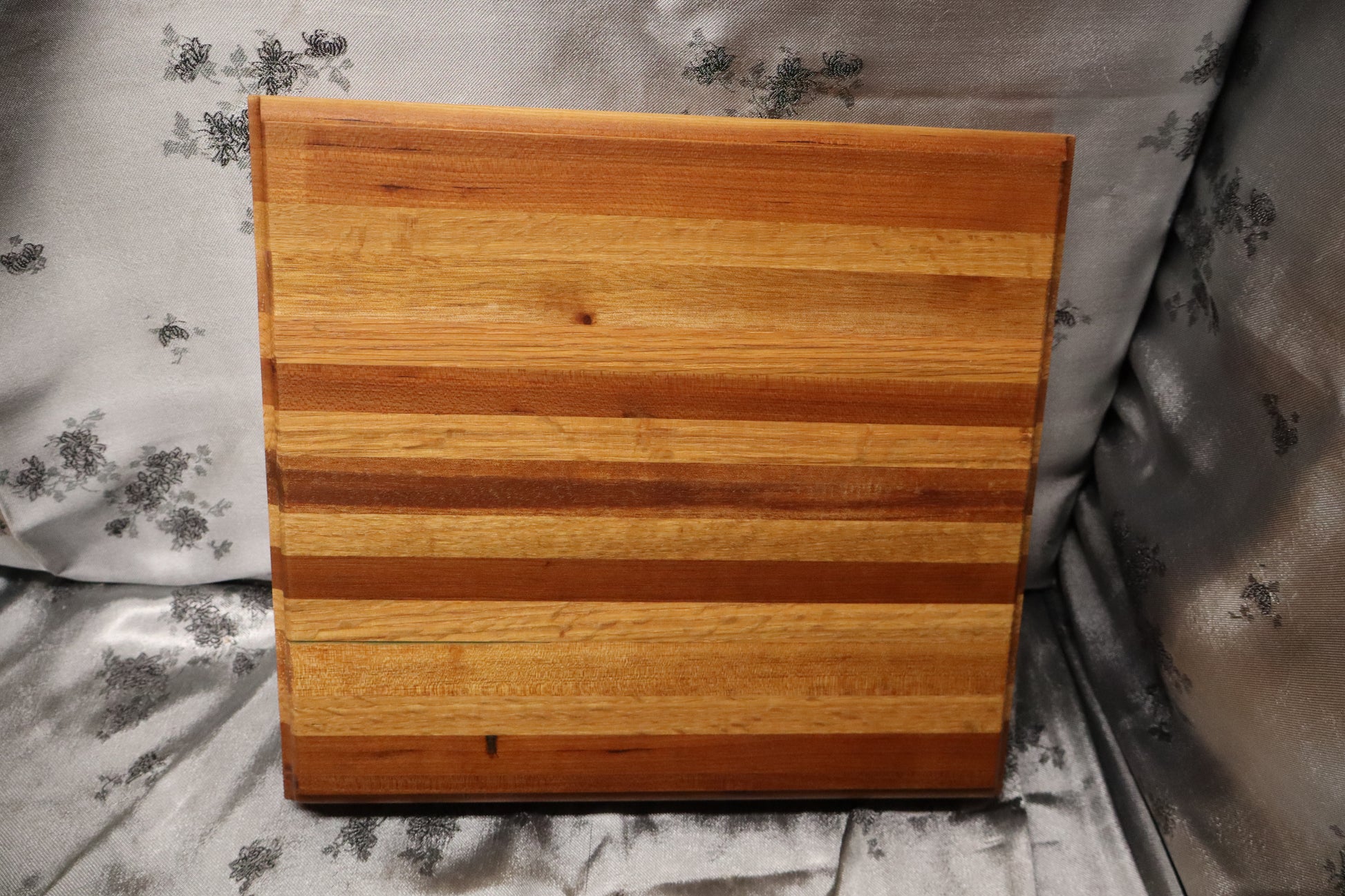 This beautiful American Cherry, Red Oak and Maple board is perfect for cutting veggies, steaks, or really anything you'd like! It's amazing unique edge details will have people asking about it constantly. – 11” x 12” x 1-5/16” dimensions. Made from kitchen tables and a dresser.