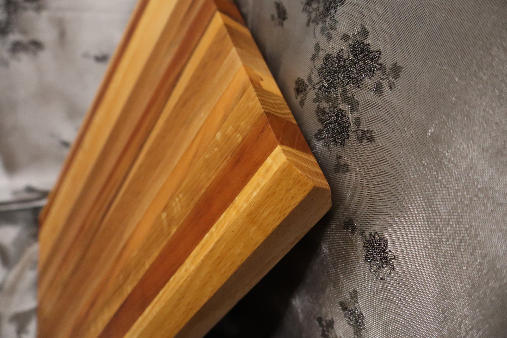 This stunning American Cherry, Red Oak and Maple board is perfect for big steaks, charcuterie, snacks, and anything else you may be interested in. It's amazing wood grain patterns will surely make it a conversation piece. – 11-5/8” x 15-1/2” x 1-1/4” dimensions – made from kitchen tables and a dresser -