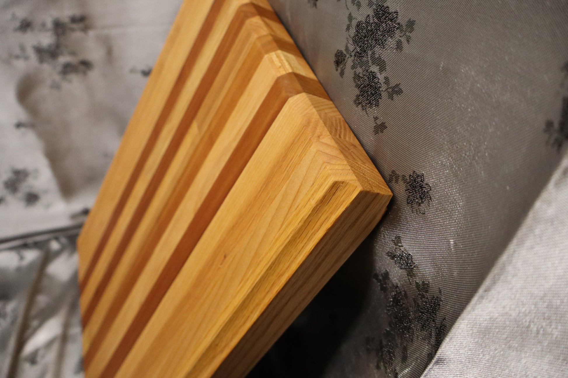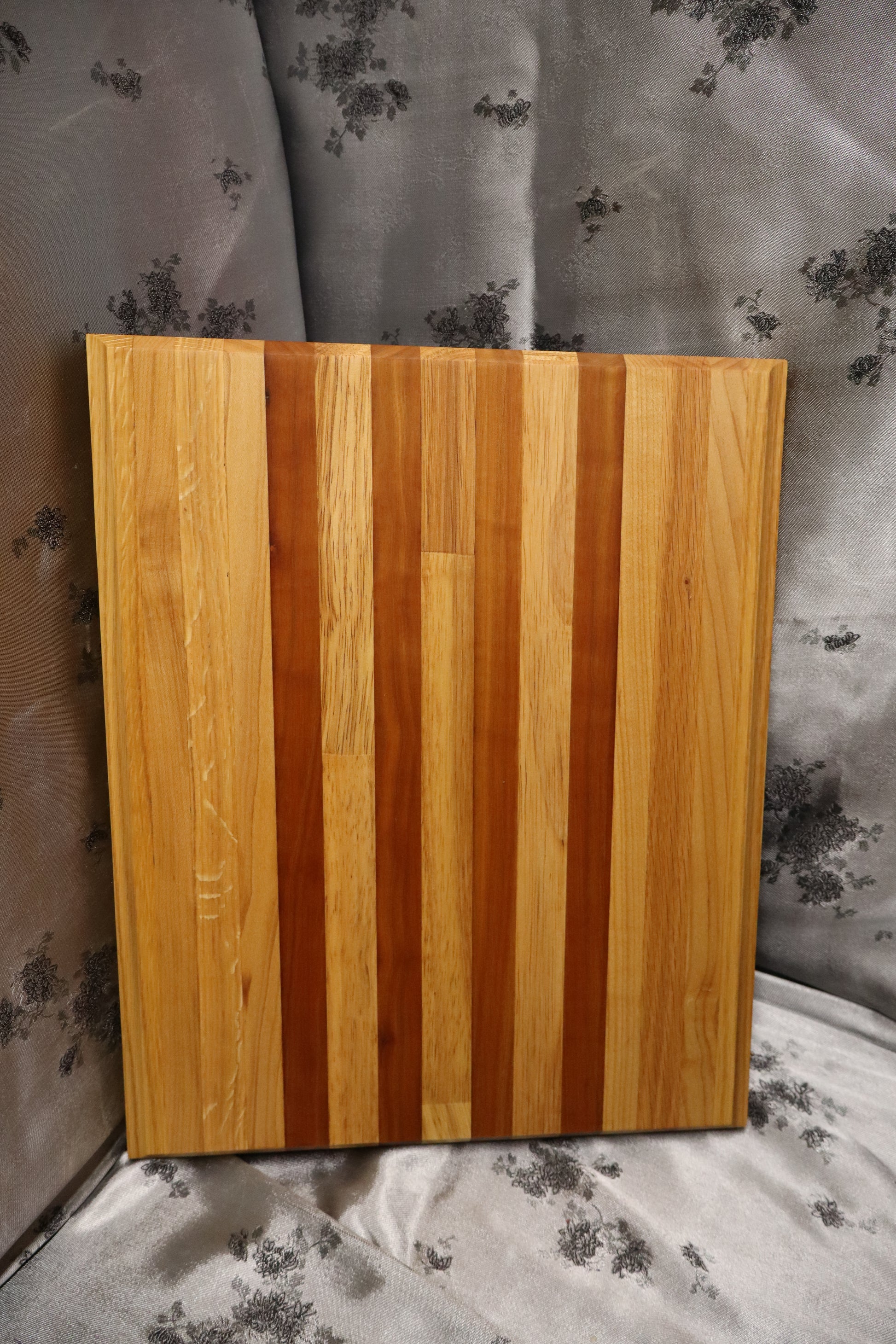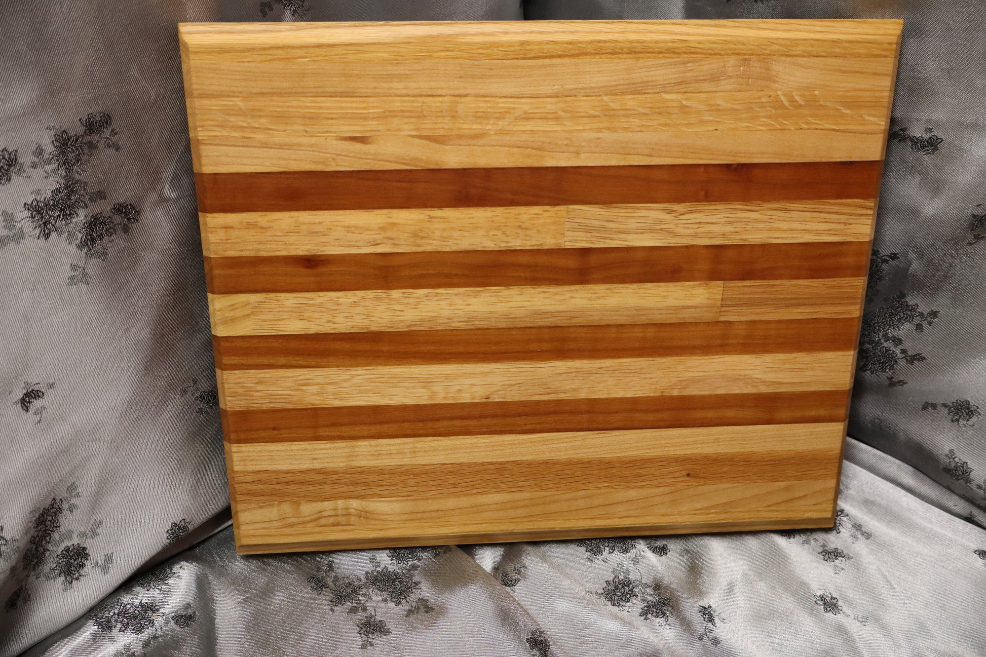 This amazing American Cherry, Red Oak and Maple board has 4 distinct and outstanding cherry strips down the middle, making it a showstopper. It's perfect for any large kitchen applications you may have. – 12-1/4” x 15-3/8” x 1-1/4” dimensions – made from kitchen tables and a coffee table
