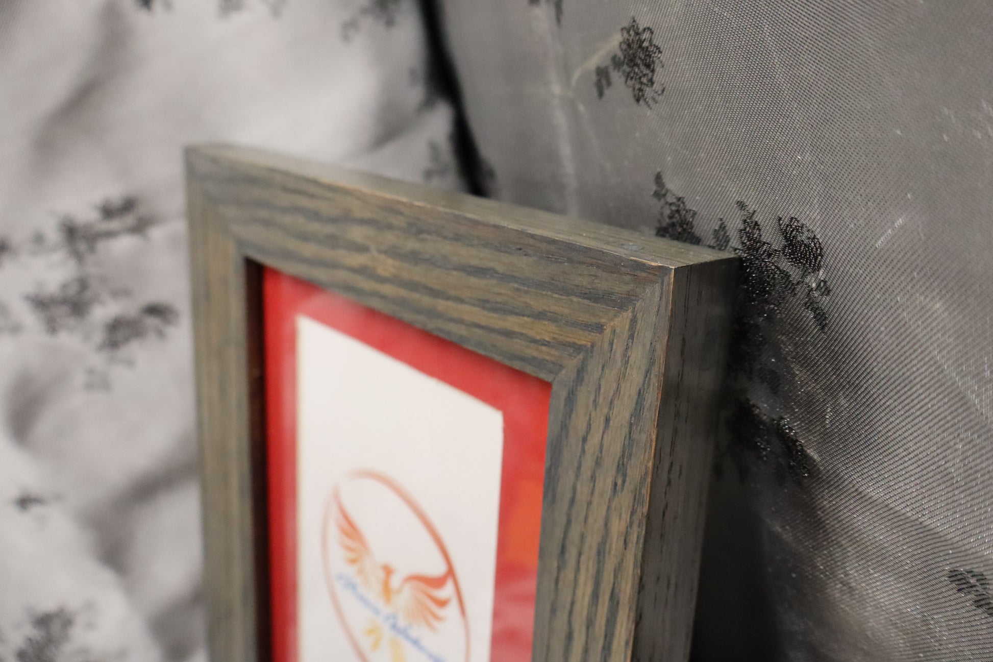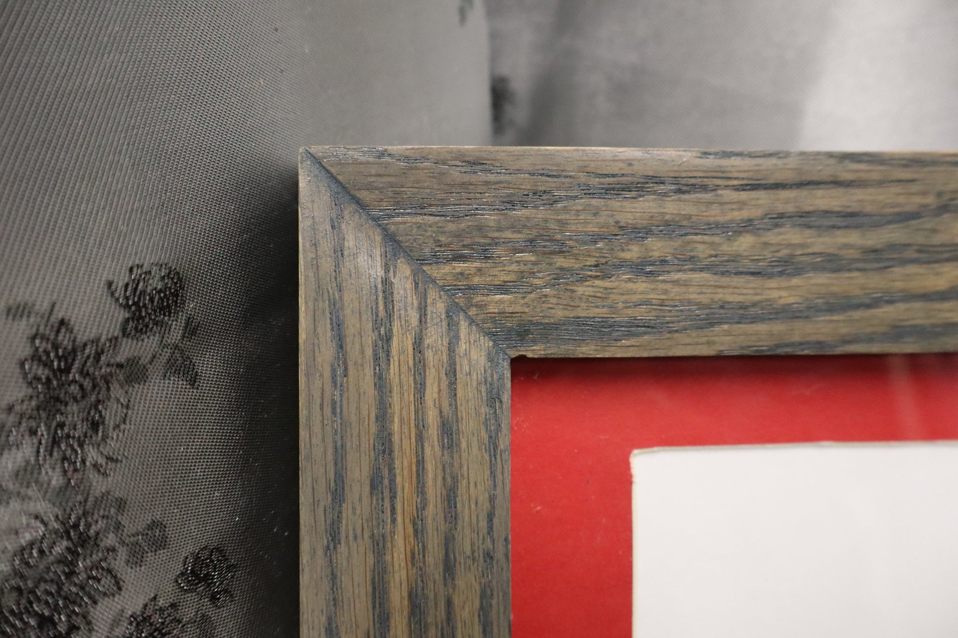 This beautiful dusk-y frame comes with a red mat to compliment the 5x7 sized picture. It's comprised of Red Oak with a Phantom Gray stain and a satin polyurethane finish - previous life: kitchen table -7x9 dimensions