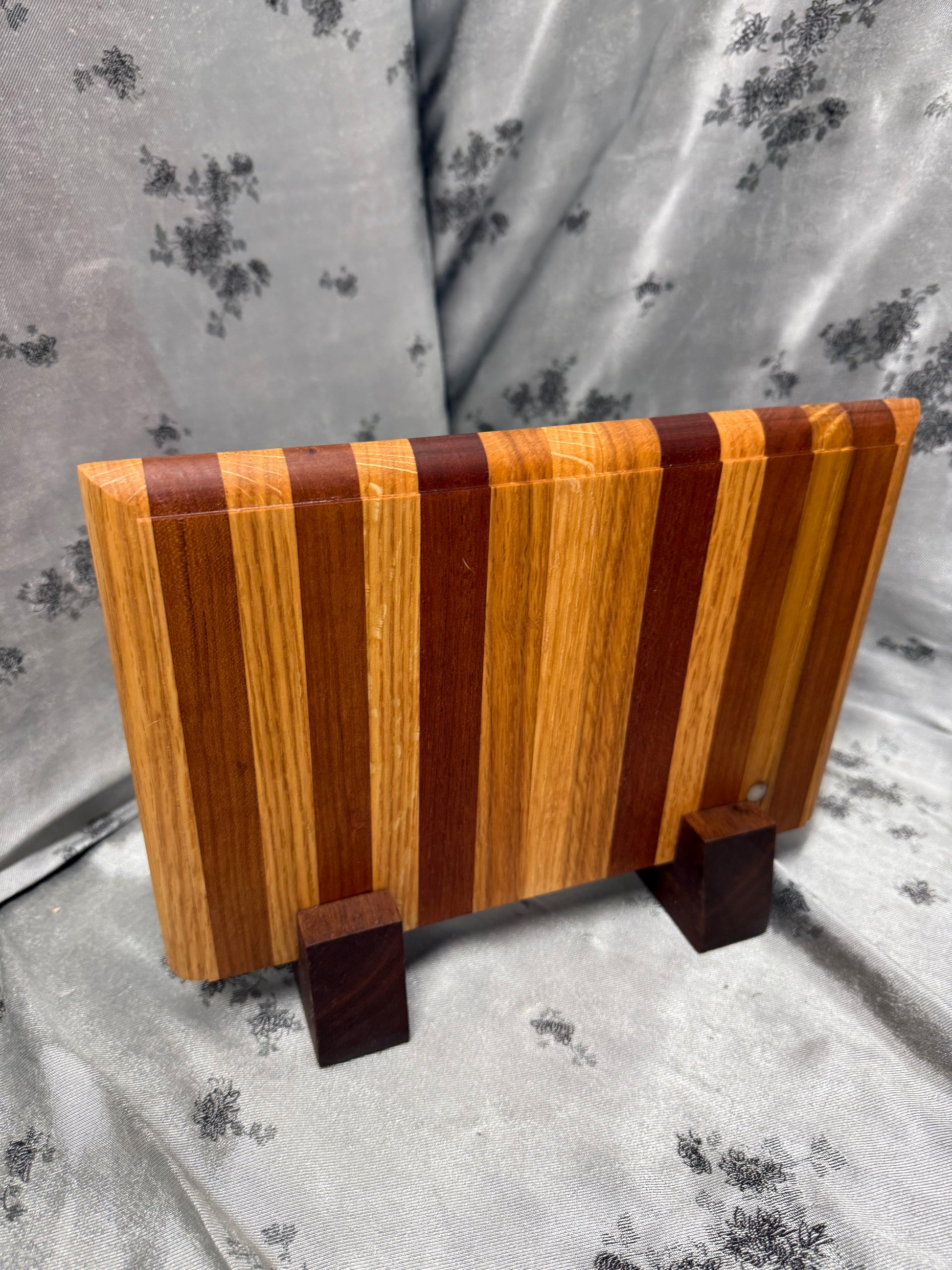 This countertop magnetic knife block is crafted from Red Oak and American Cherry reclaimed from a kitchen table and an end table, featuring beautiful natural wood tones and grain patterns. At 3 pounds, it offers both elegance and functionality, securely holding 10 knives with powerful magnets. The 7-1/4 inch by 11 inch by 1 inch block sits on Walnut feet for stability, perfect for any refined kitchen setting.