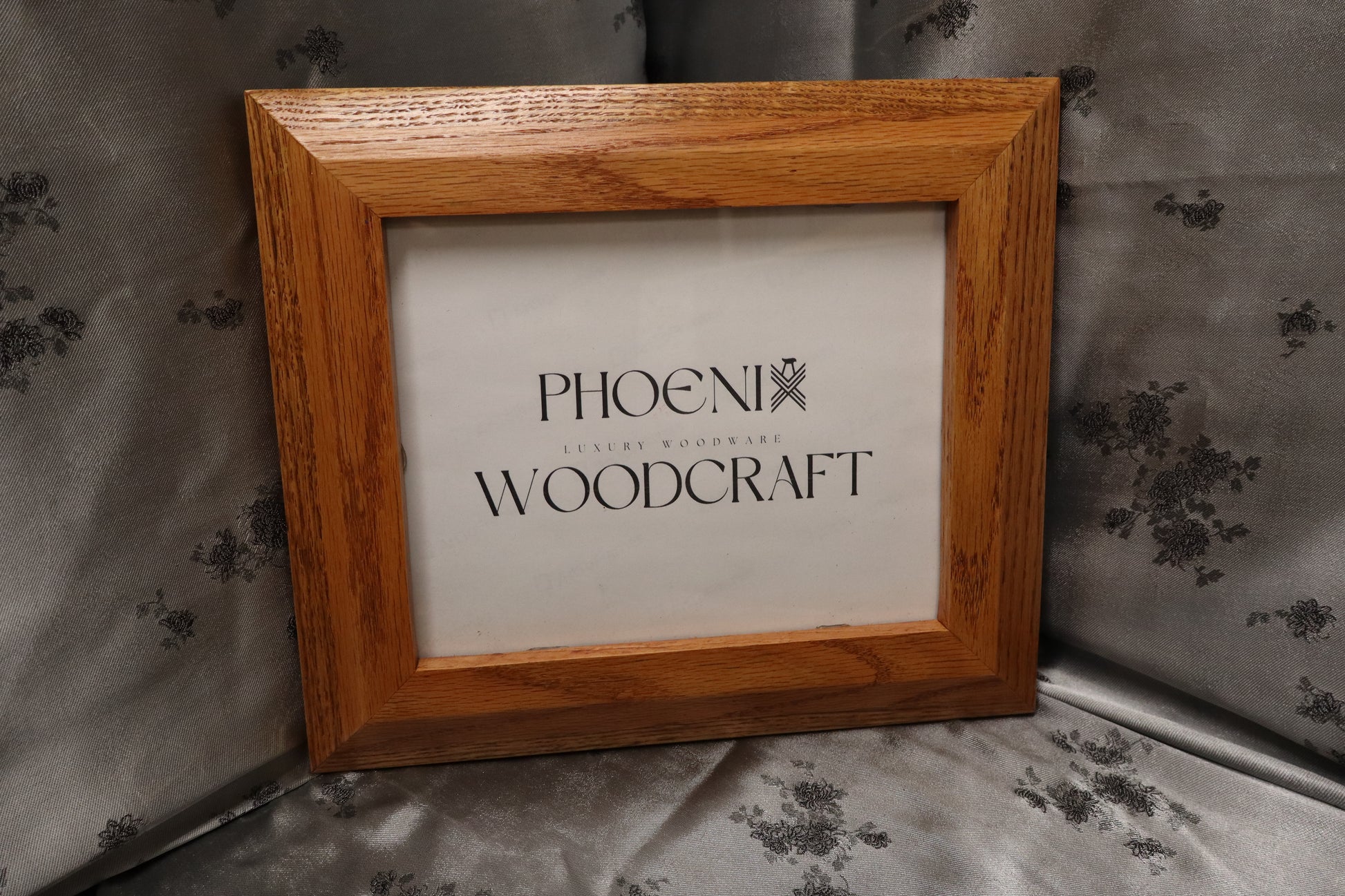 This beautiful frame is made from Red Oak with a Red Chestnut stain and a semi-gloss polyurethane finish. Perfect for family photos, or really any scene you'd like!