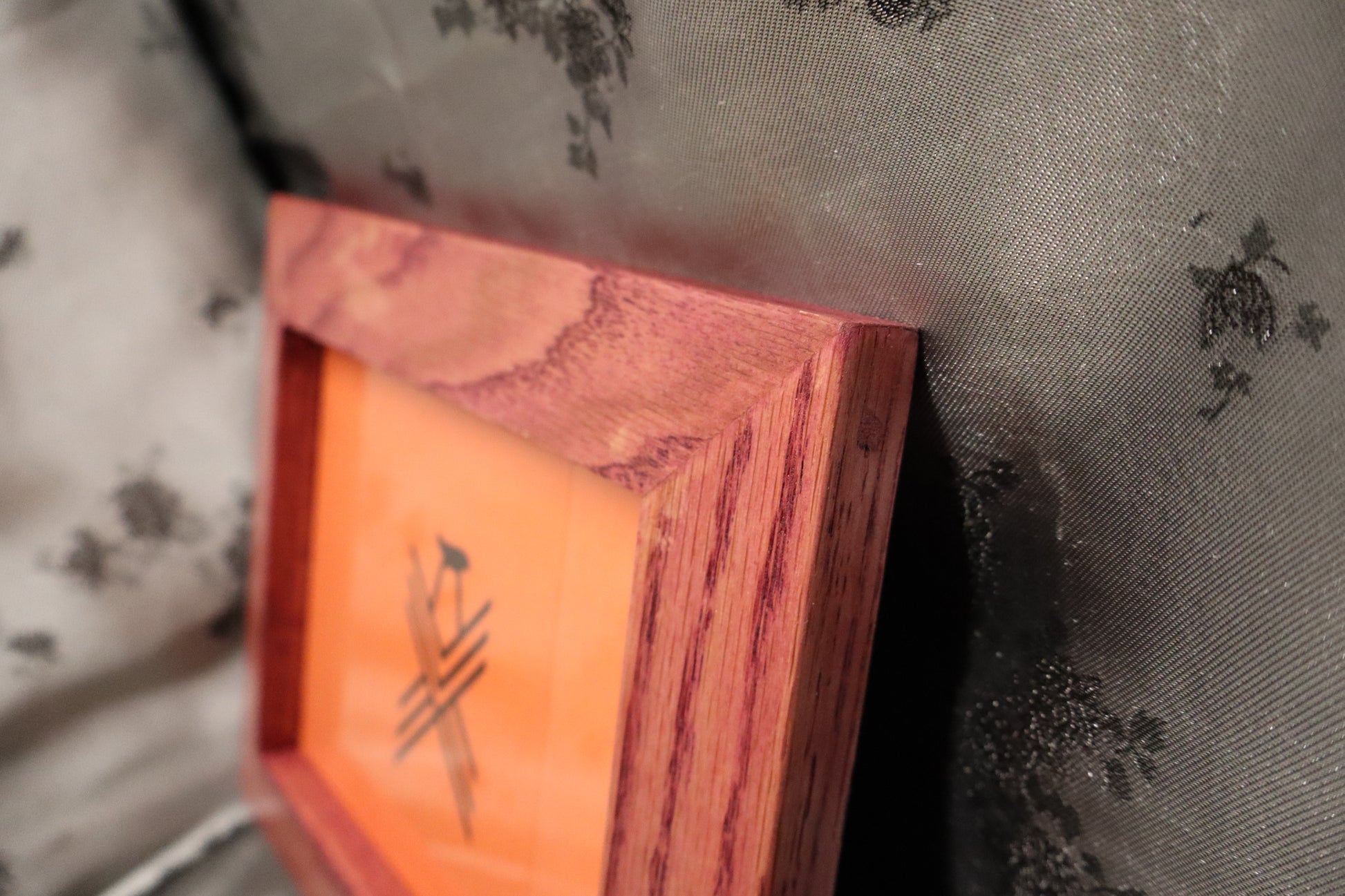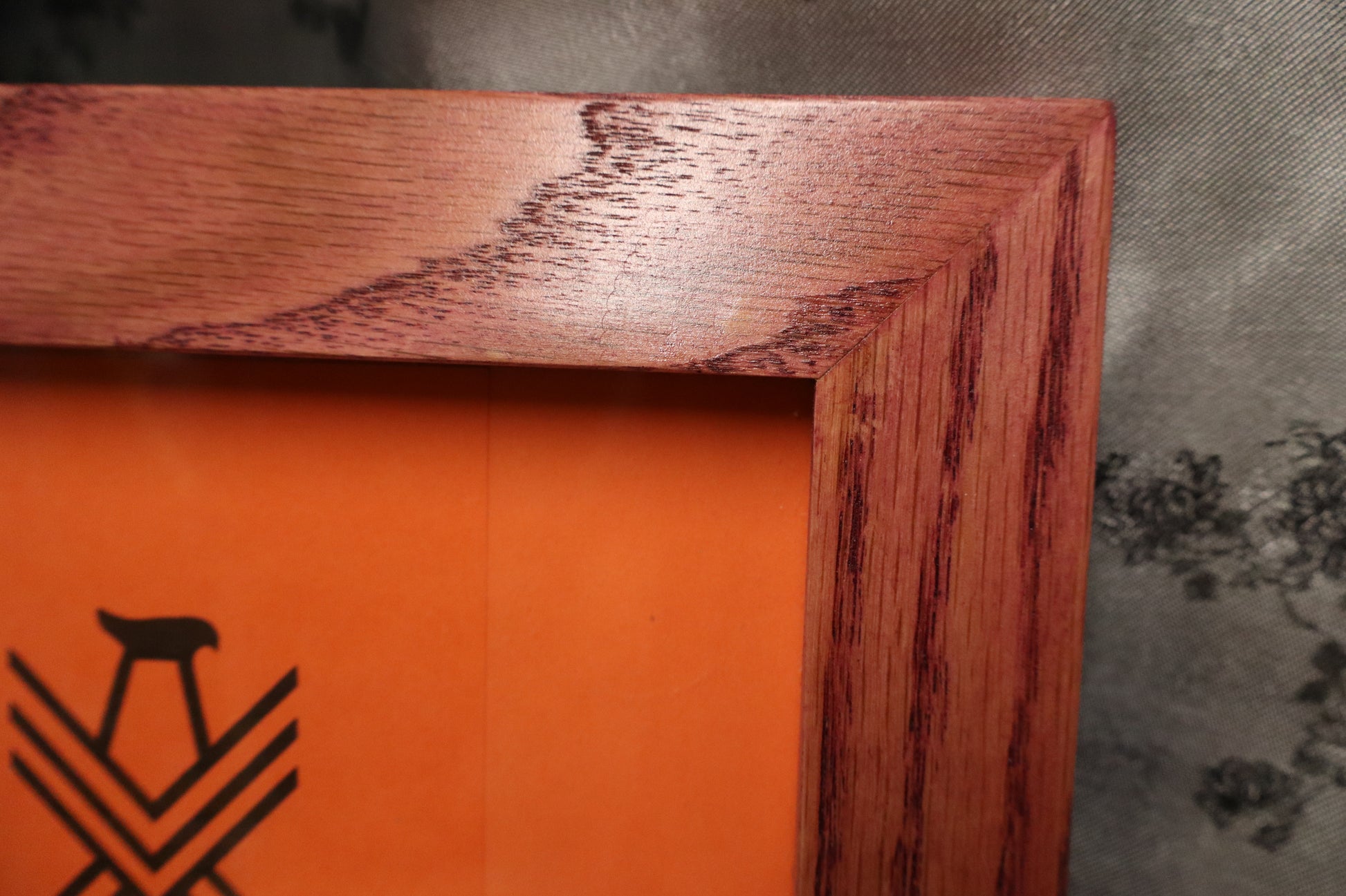 This frame is perfect for your desk at work, coffee table, or even just hanging up in the family room. Its made from Red Oak with a Cherry Blossom stain and a satin polyurethane finish.