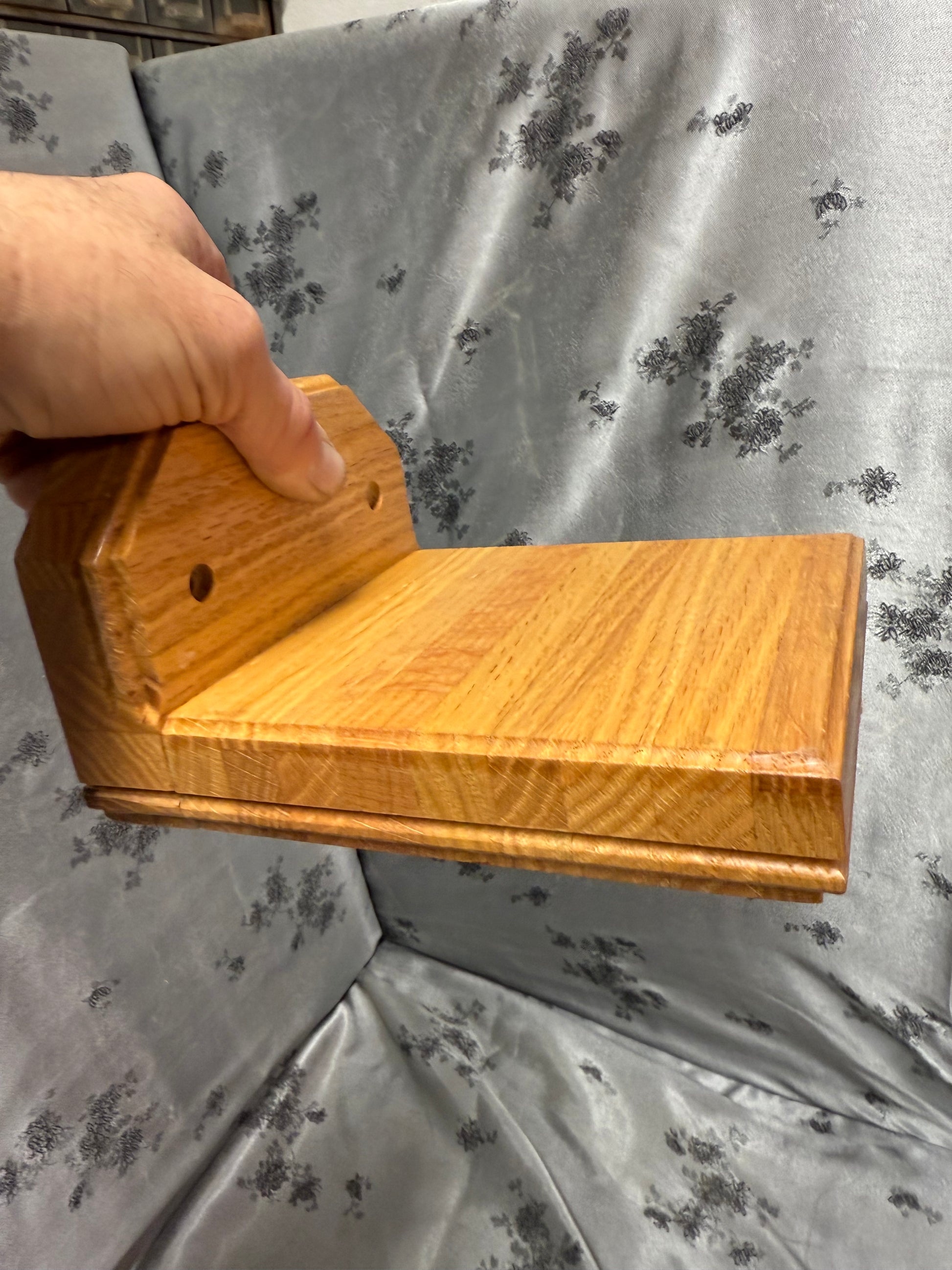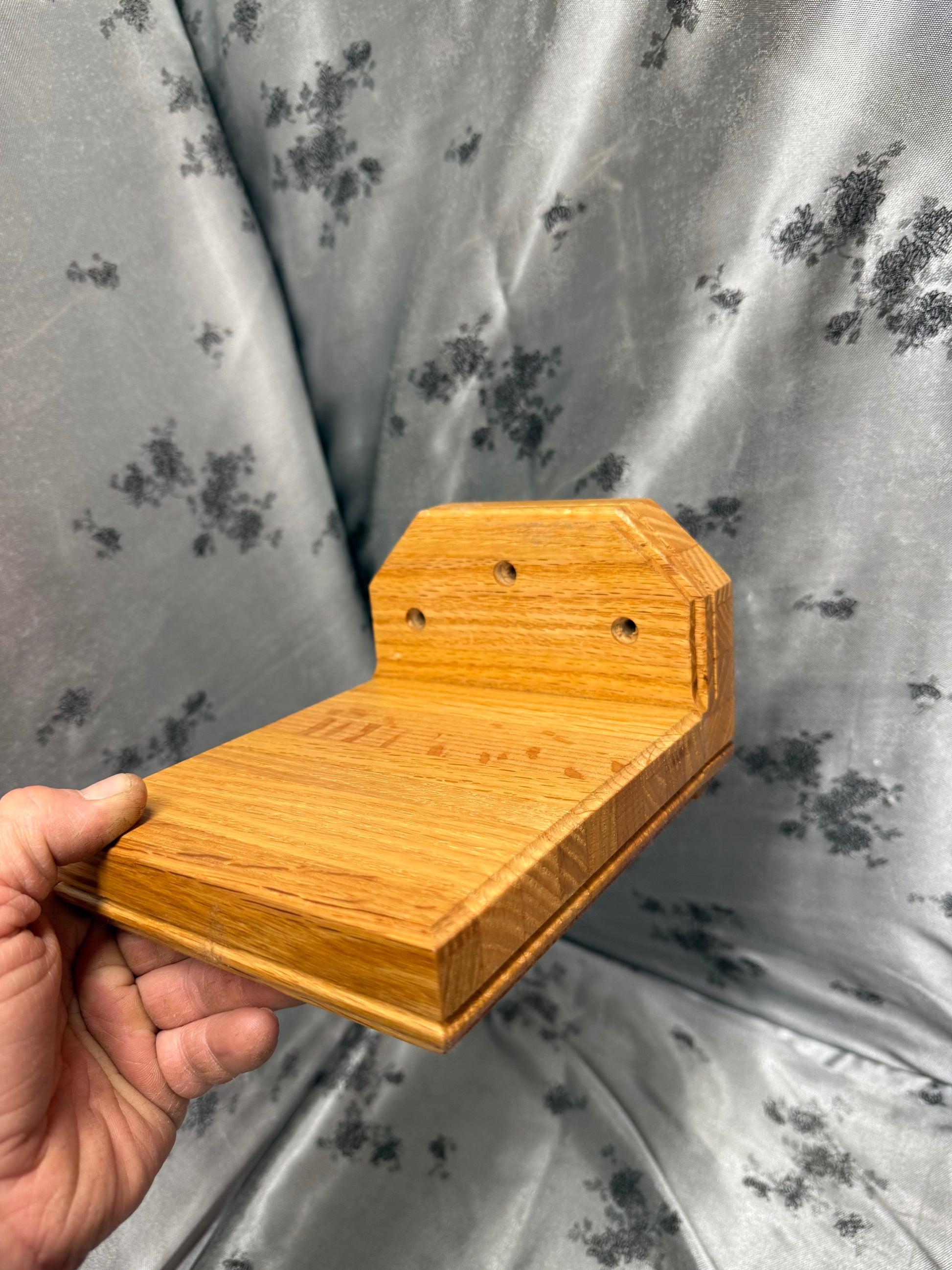 This wall-mounted plant stand is crafted from Red Oak, featuring beautiful natural wood grain and a waterproof lacquer finish. At 1.7 pounds, it offers both elegance and durability, perfect for displaying plants or other small items on your wall. Matches with PS#8 for a coordinated look. Dimensions: 5-5/8 inches by 7-1/4 inches by 1-1/4 inches.
