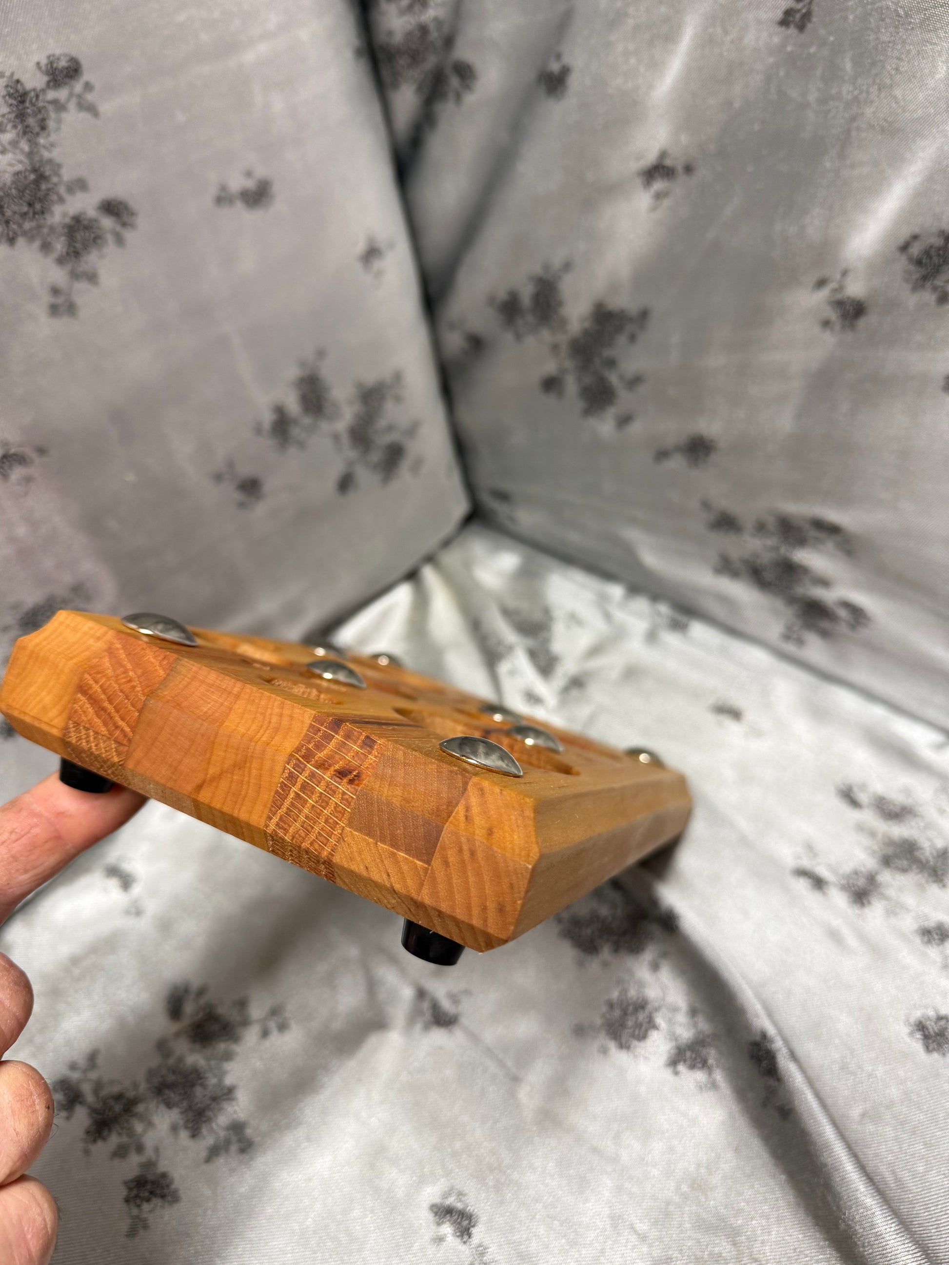 This rivet trivet is crafted from Red Oak and Maple reclaimed from a kitchen table and a desk, featuring beautiful natural wood tones and grain patterns. At 1.4 pounds, it offers both elegance and functionality, safely protecting surfaces from hot dishes up to 550 degrees. Perfect for serving hot pots, pans, and dishes in any refined kitchen or dining setting. Dimensions: 10 inches by 6-3/4 inches by 1-1/8 inches.
